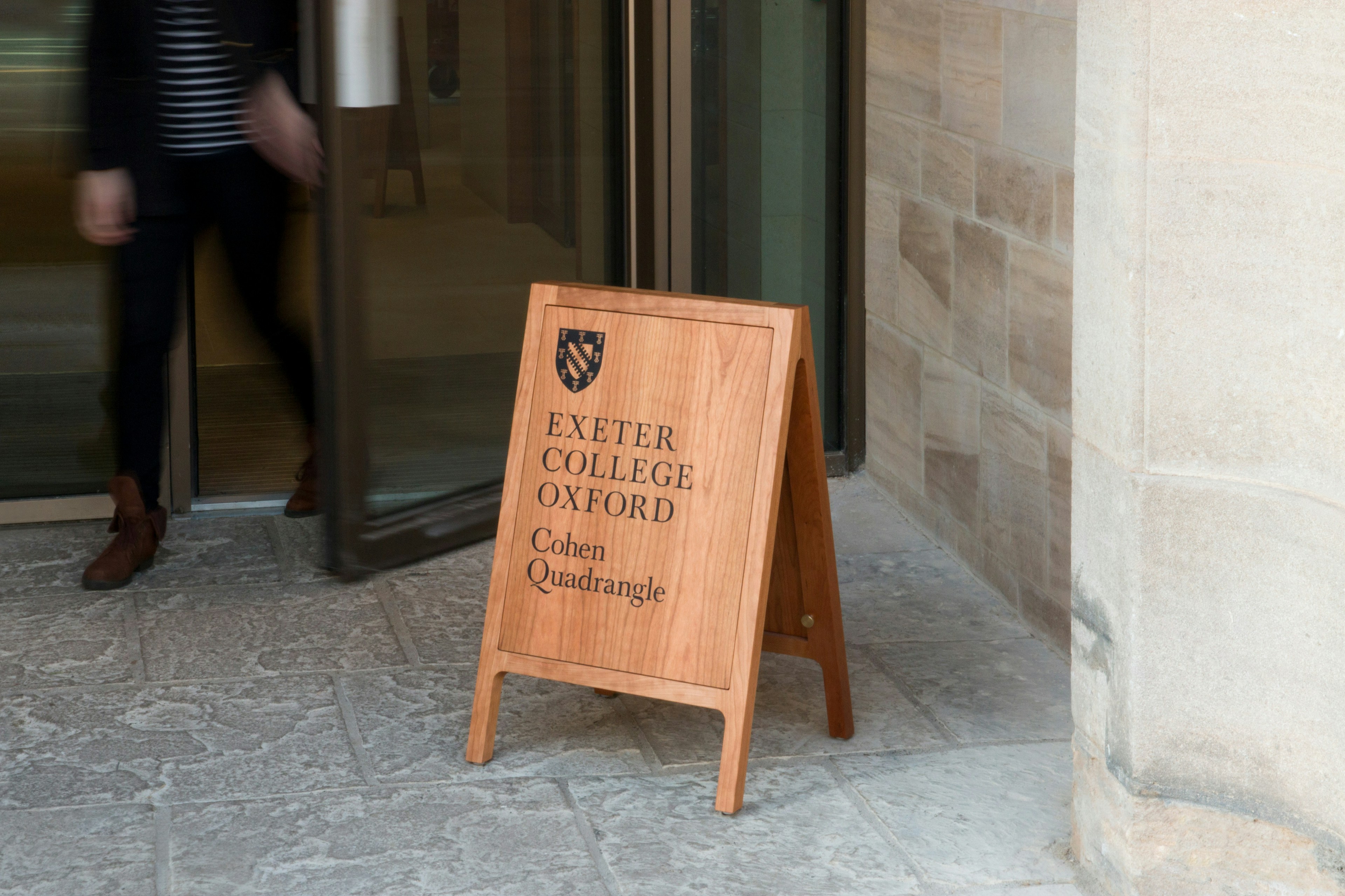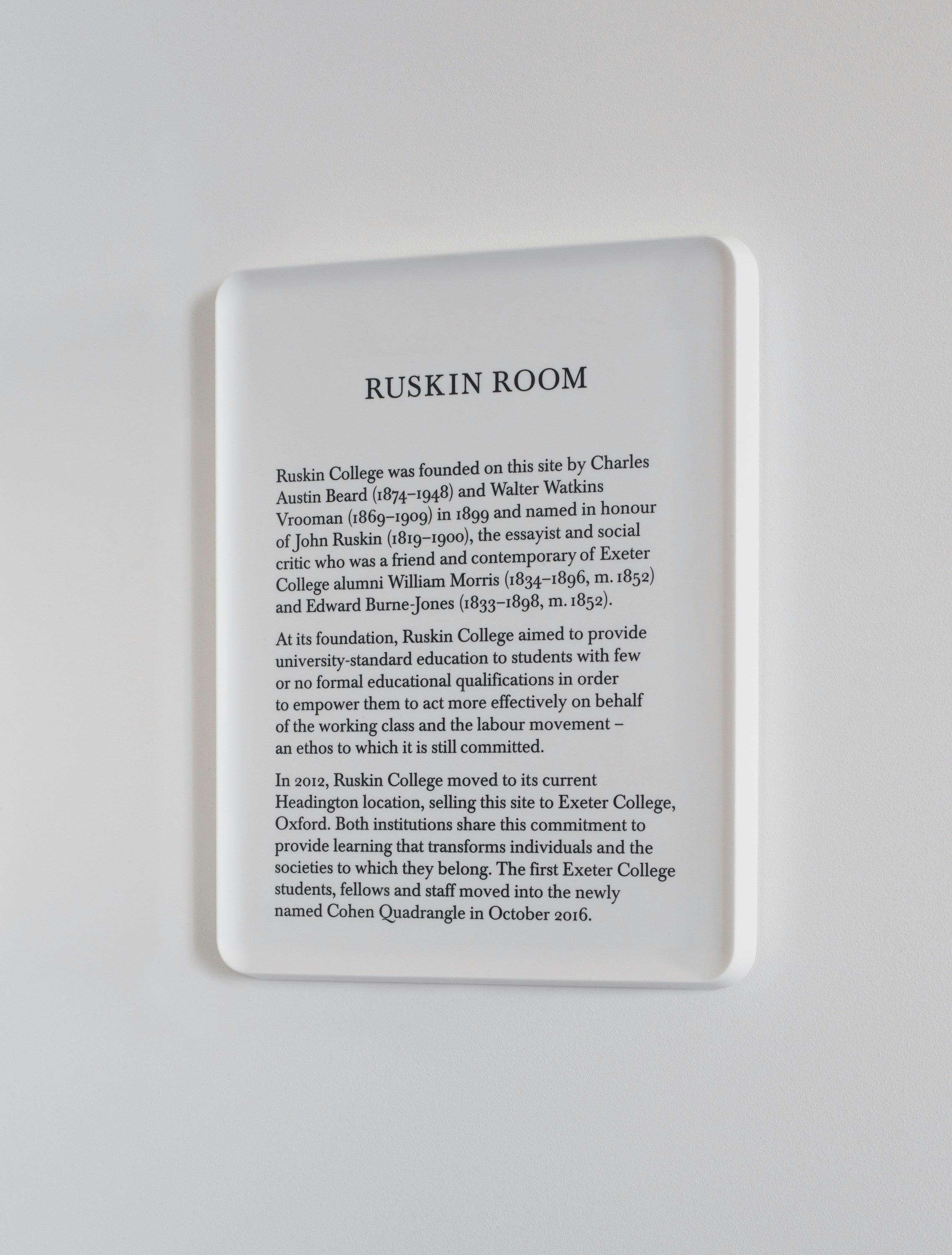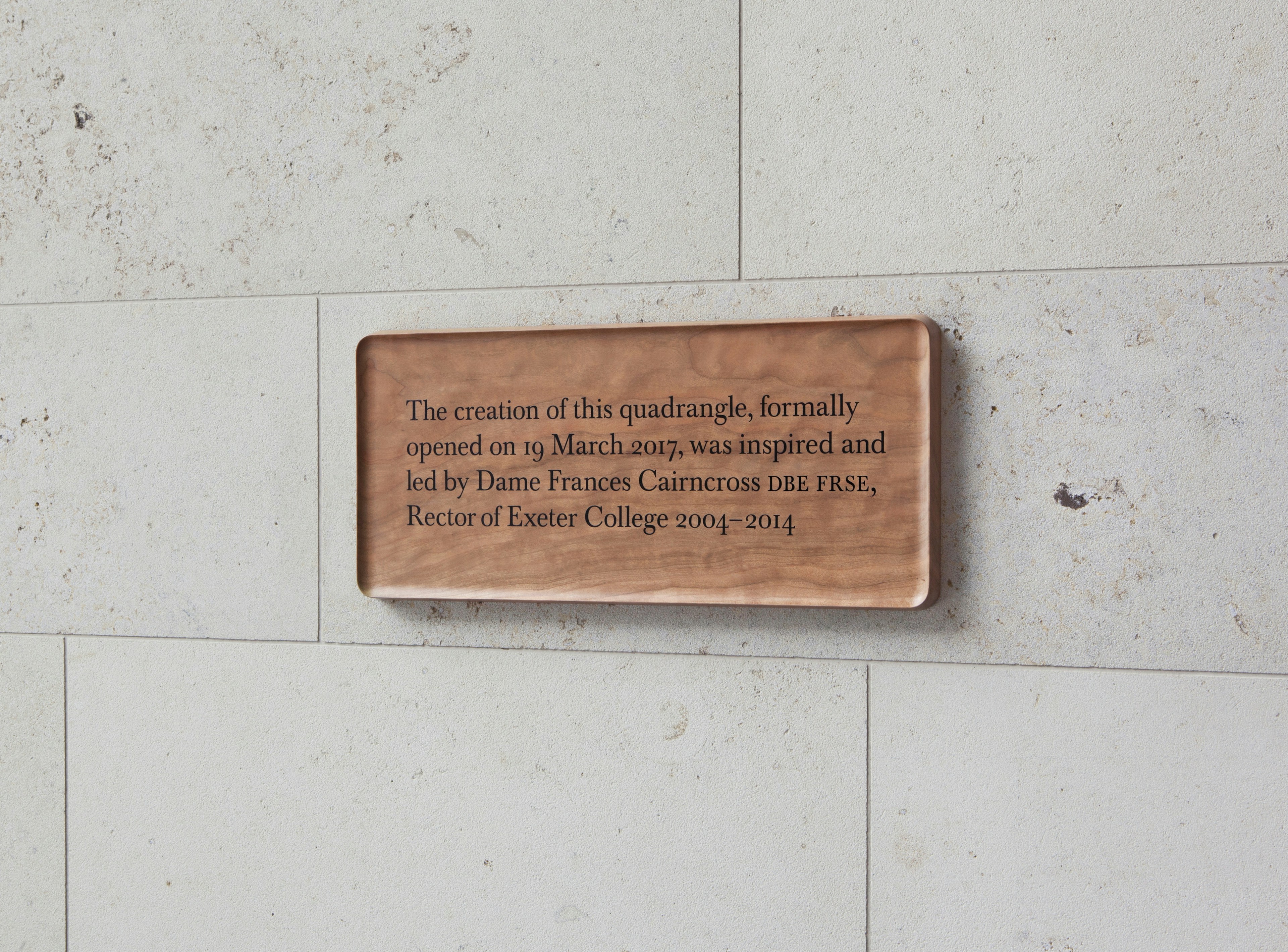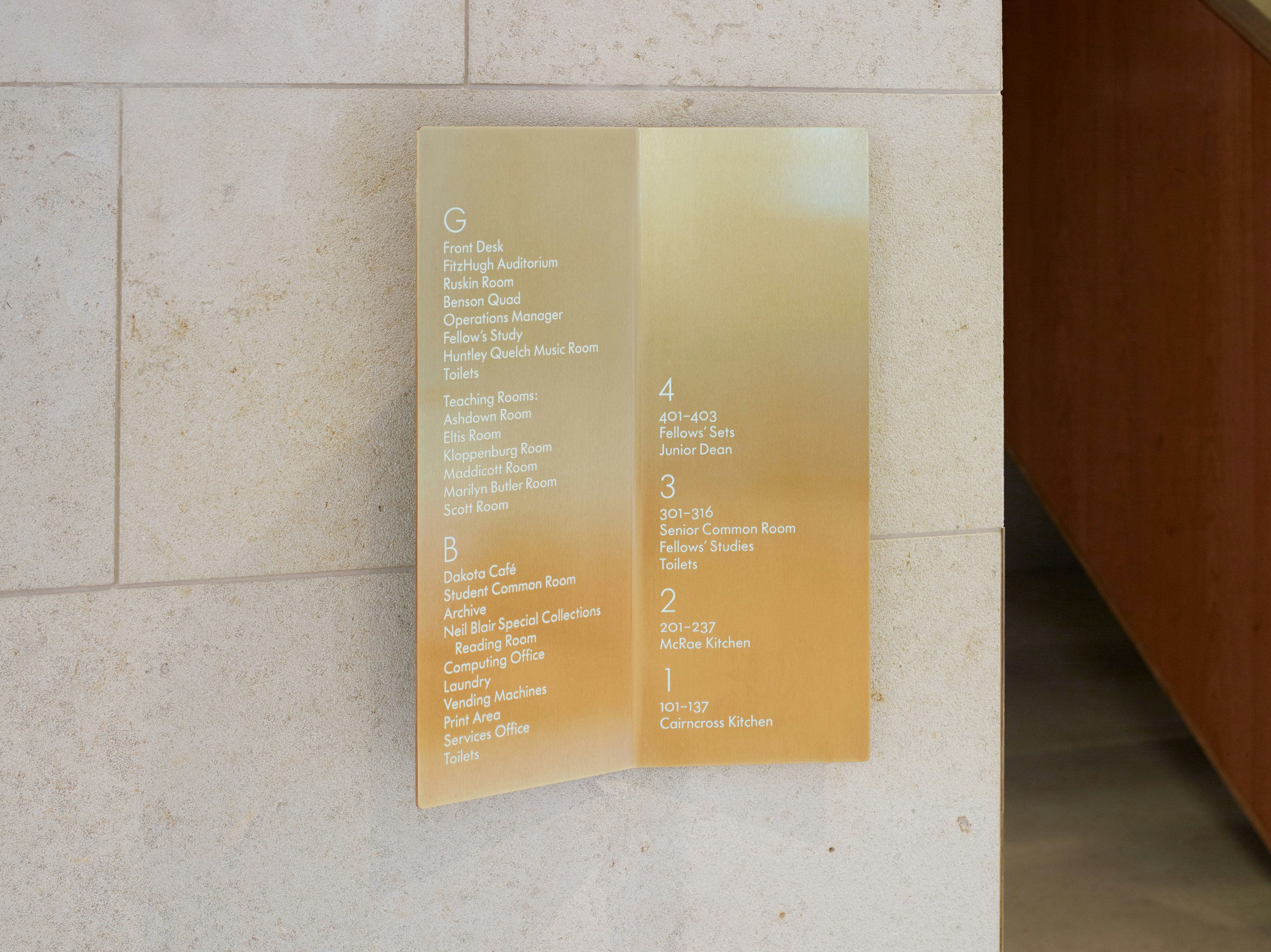 A titling typeface was drawn by typographer and stone cutter Nicholas Sloan, for use in the building dedications. The scheme also includes a machined anodised aluminium wall clock that sits above the Porters Lodge and 5-axis CNC machined brass floor level numerals.