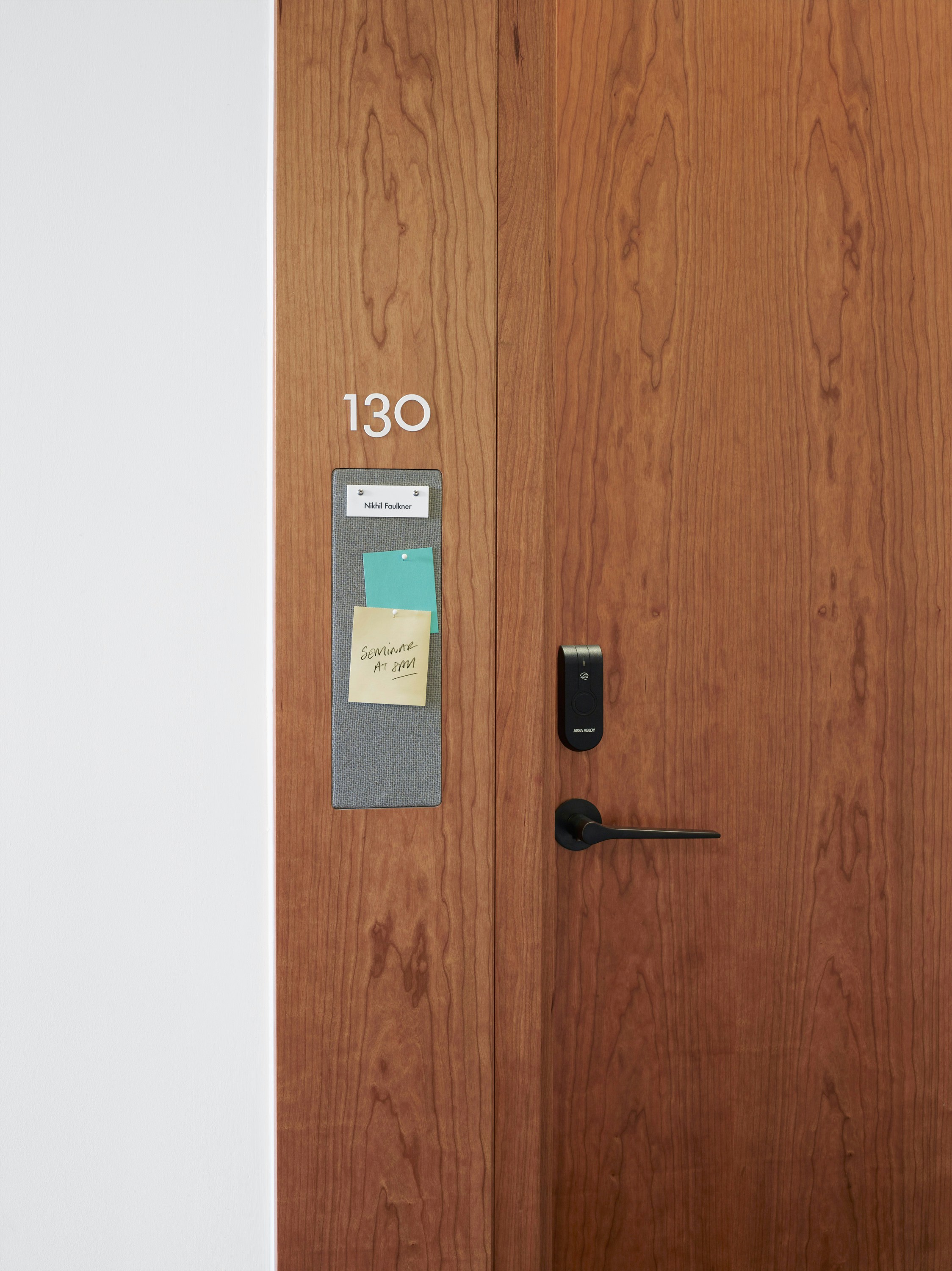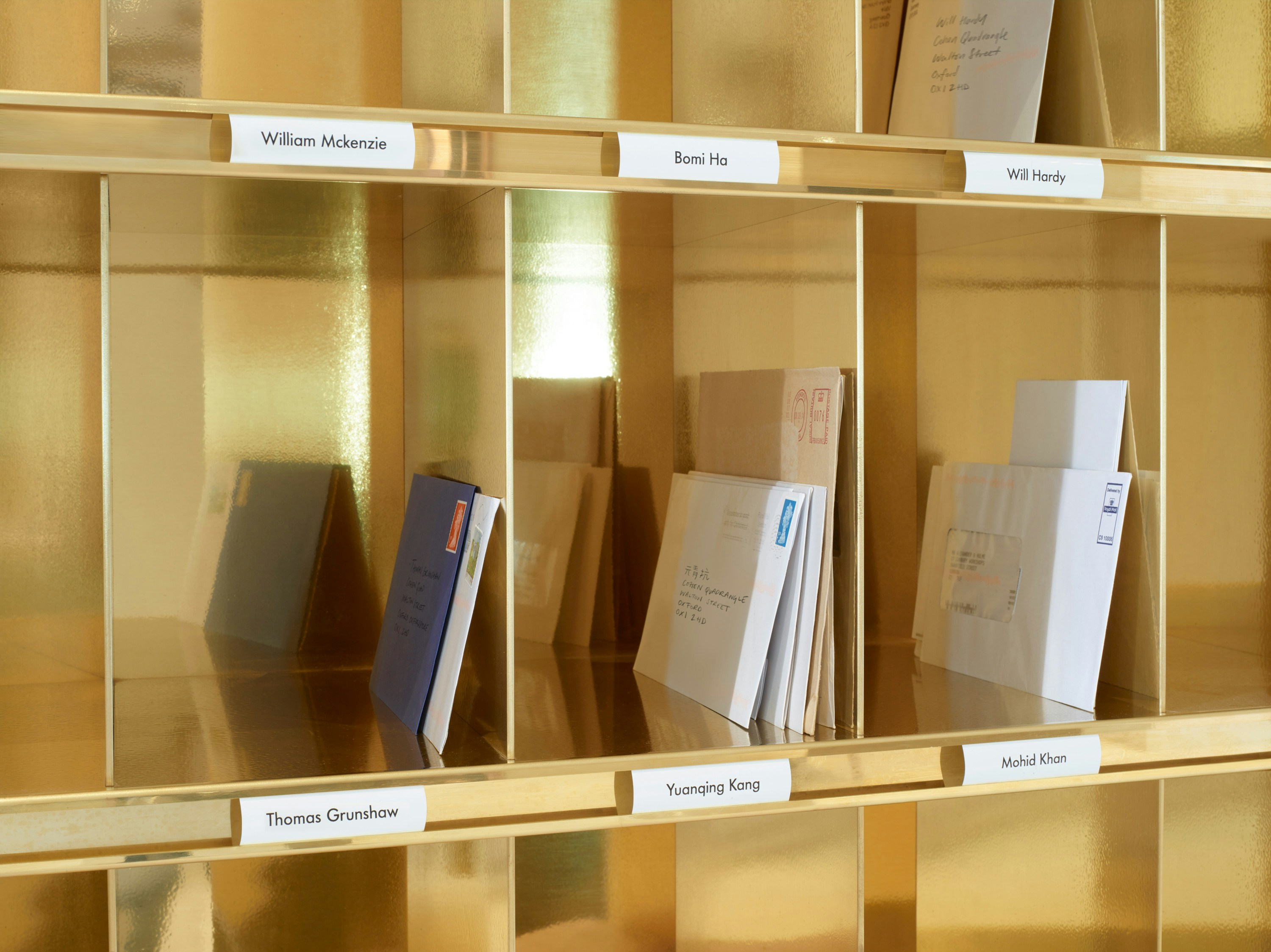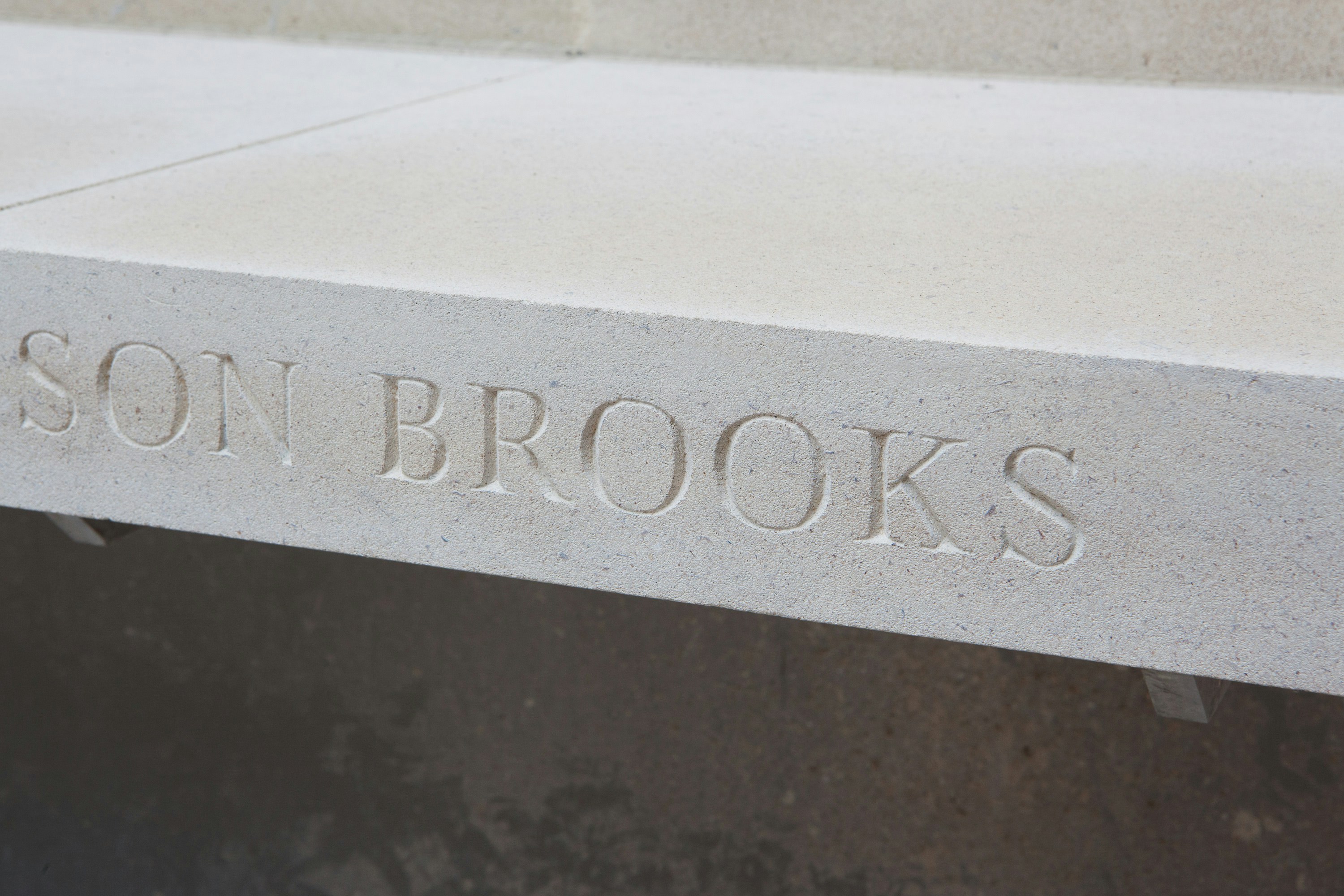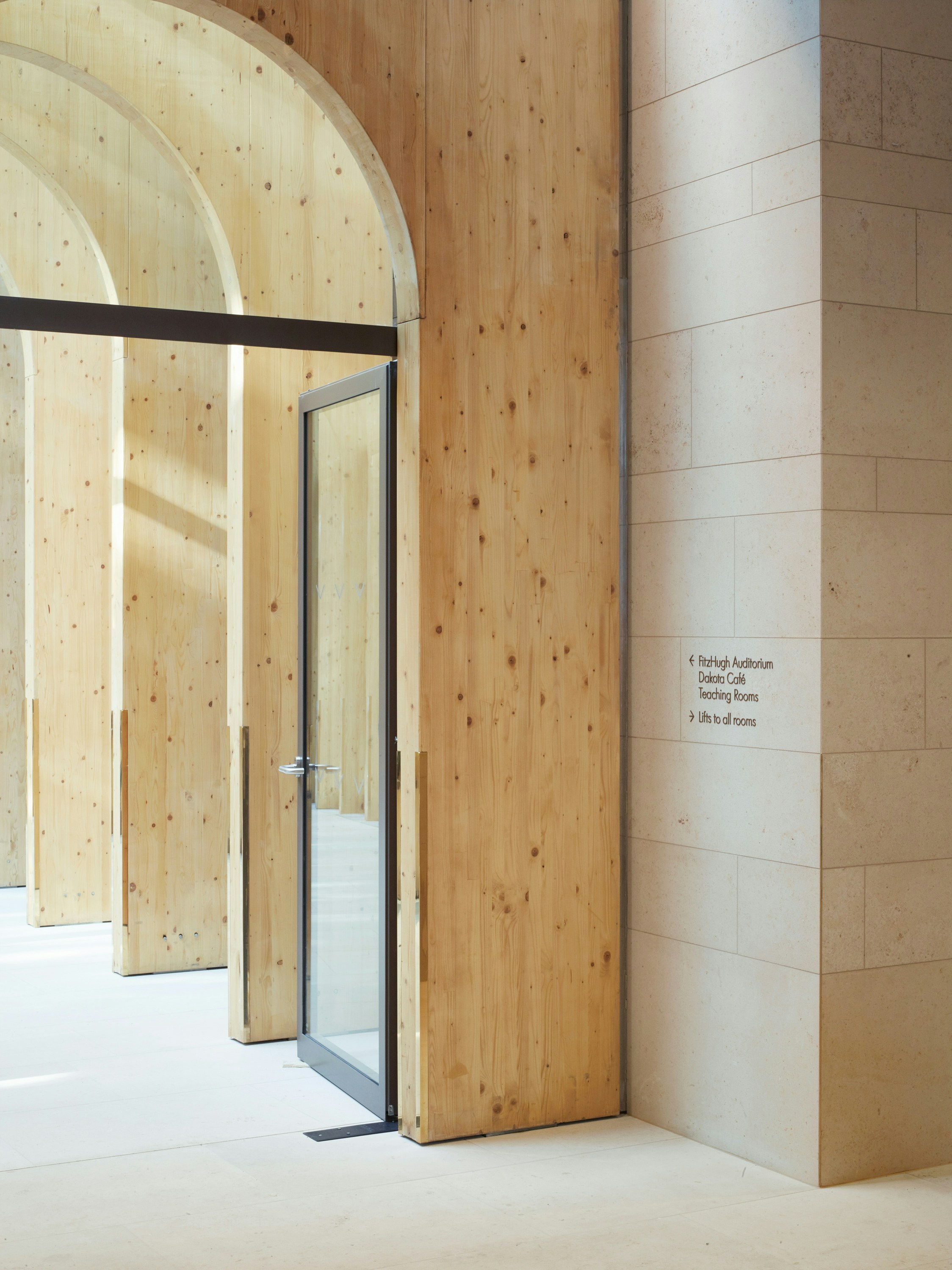 A titling typeface was drawn by typographer and stone cutter Nicholas Sloan, for use in the building dedications. The scheme also includes a machined anodised aluminium wall clock that sits above the Porters Lodge and 5-axis CNC machined brass floor level numerals.