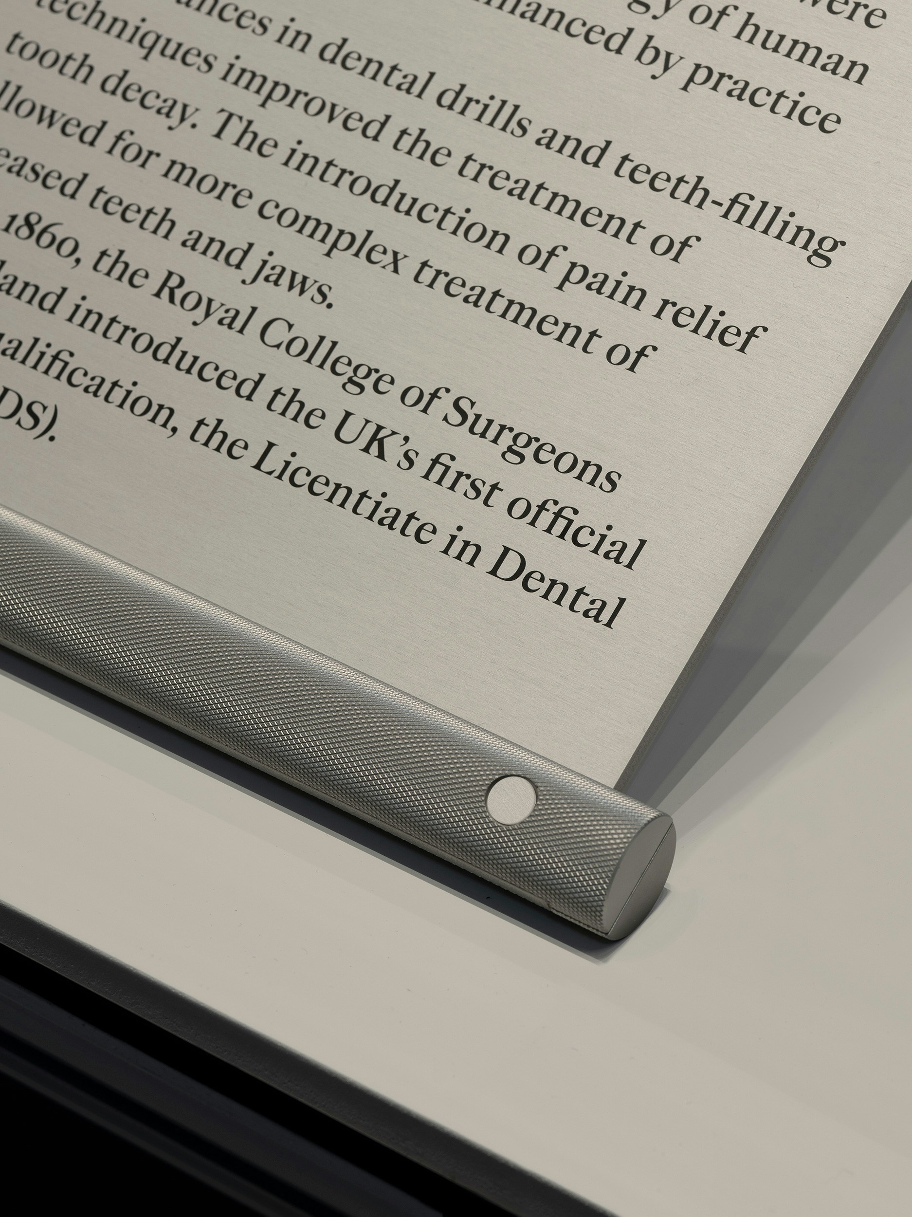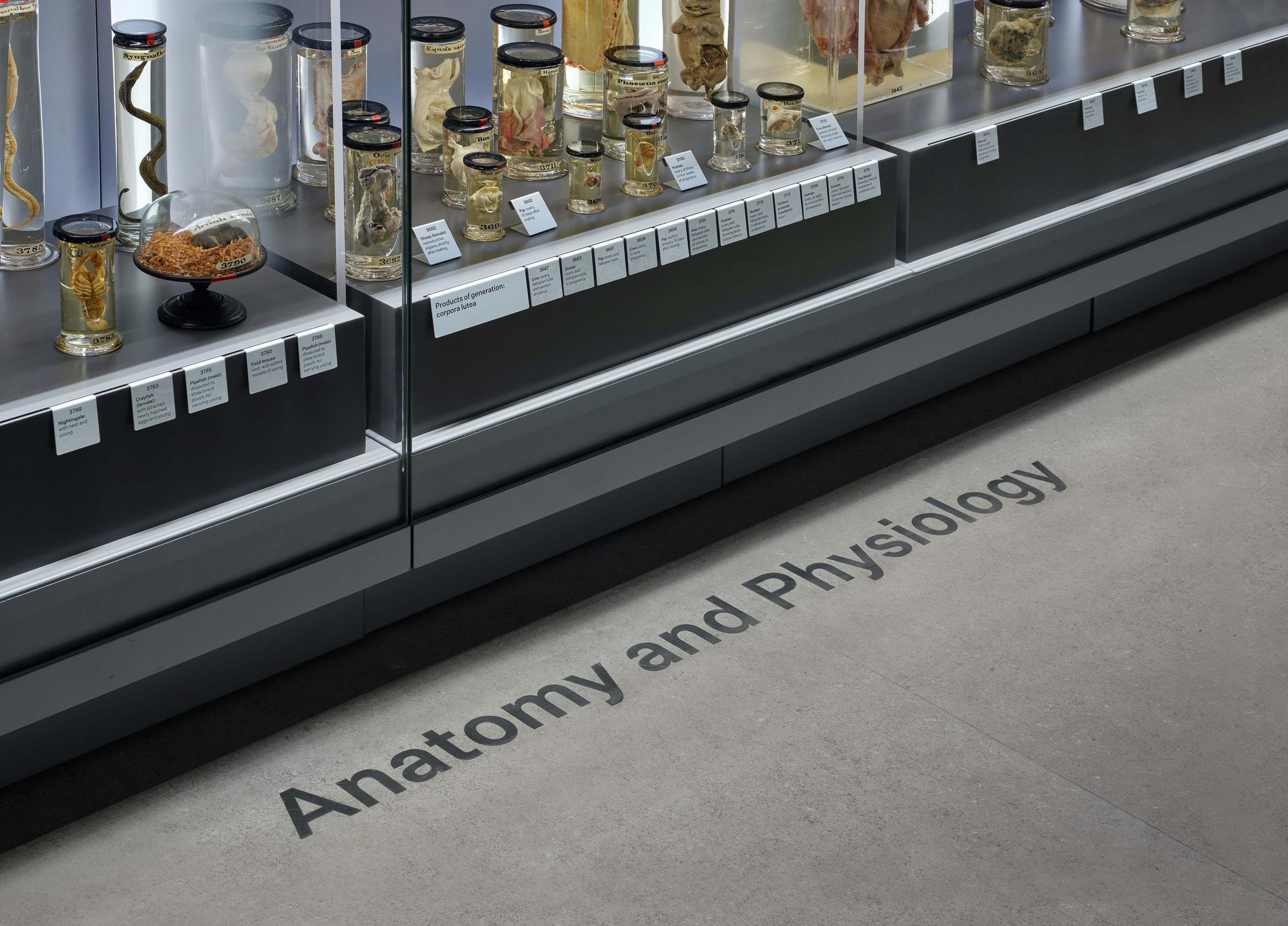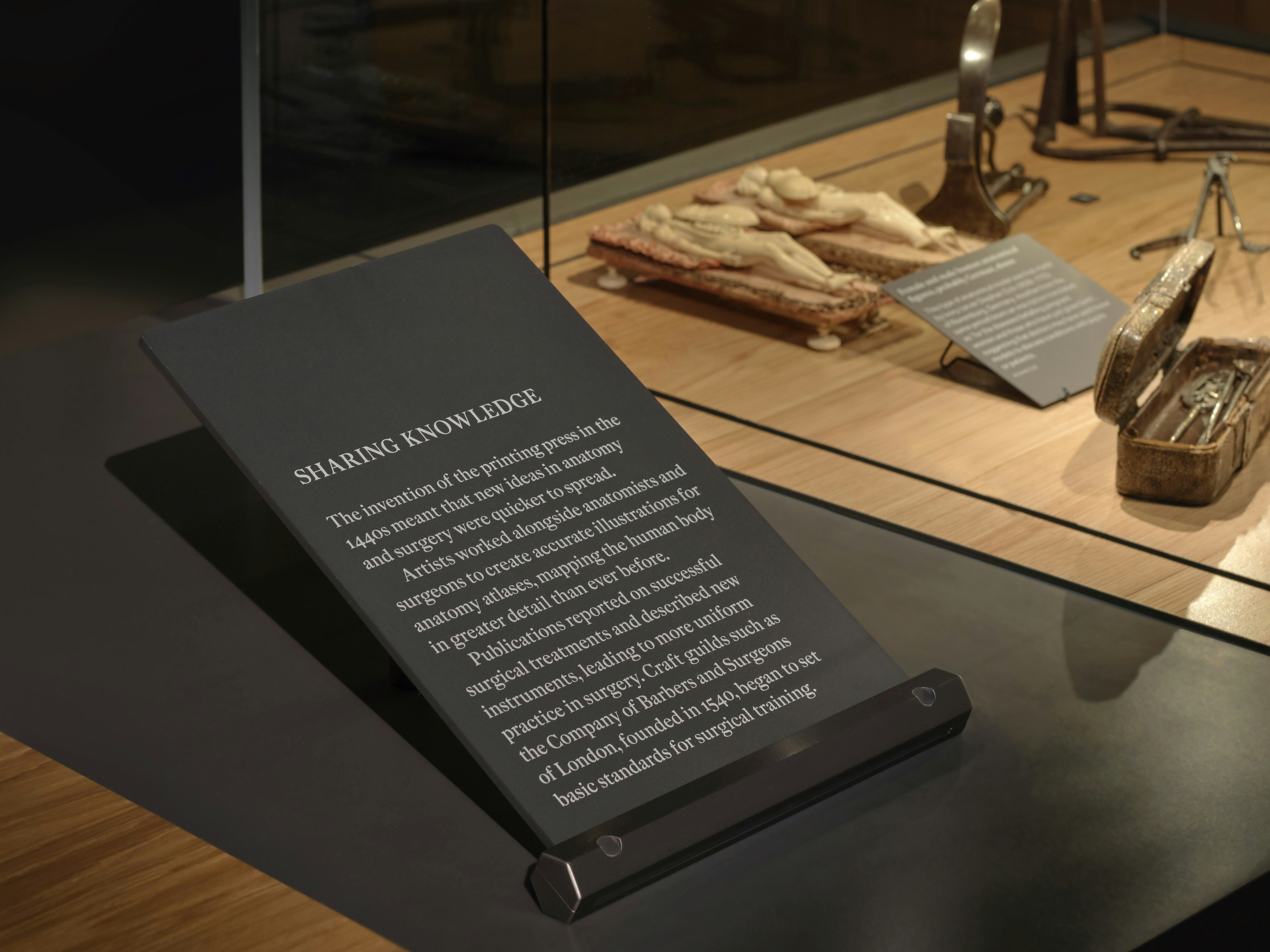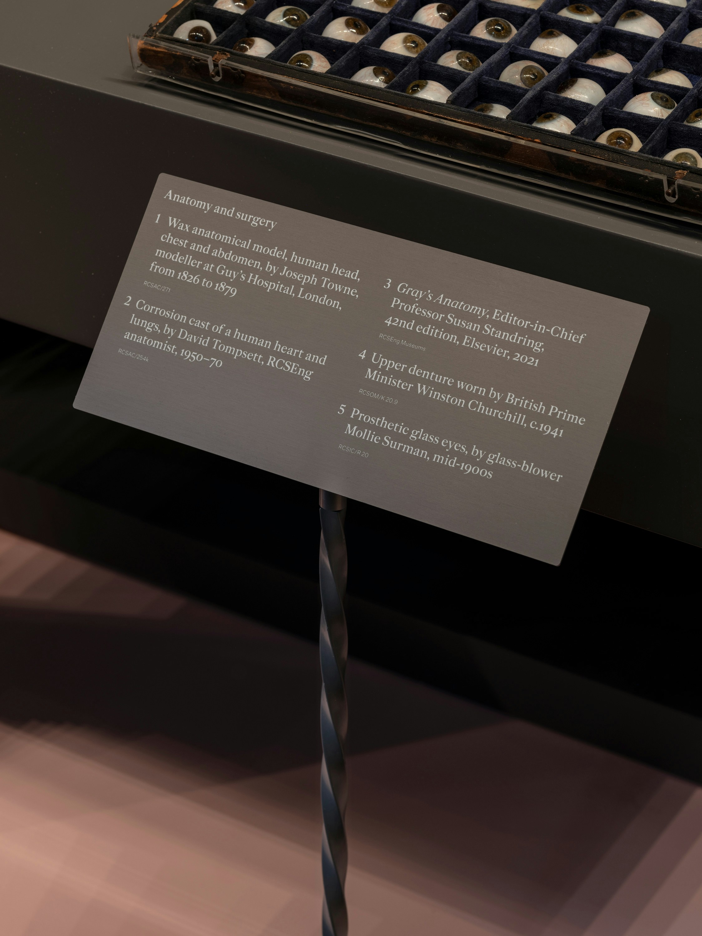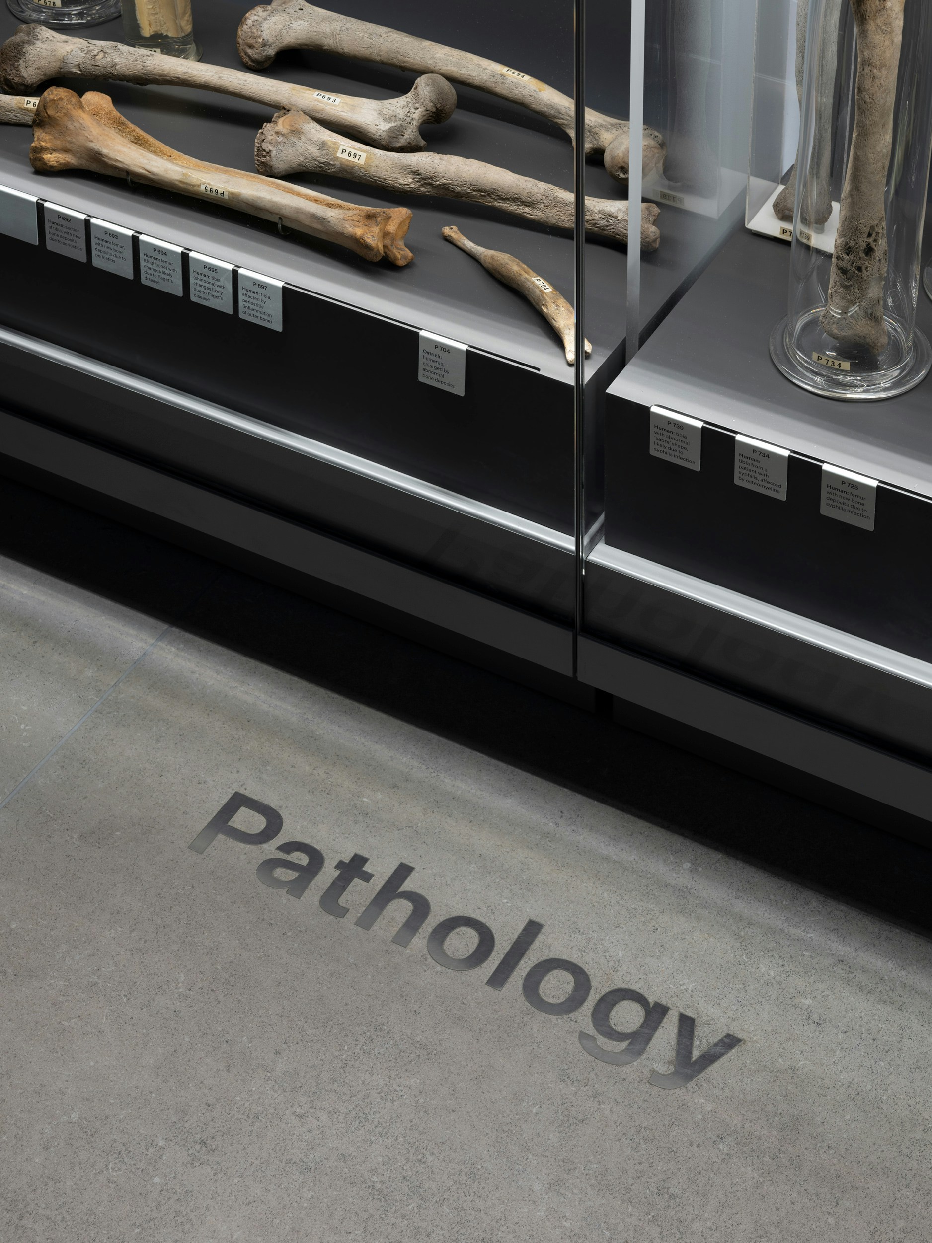 The graphic interpretation system references the forms and materials of surgical instruments and how they developed over time. Faceted, knurled and polished chrome details adorn the armatures holding object labels and text panels in place. A flexible system was devised to individually label and interpret Hunter’s specimen collection of over 2,000 anatomical specimen jars held in the Long Gallery.