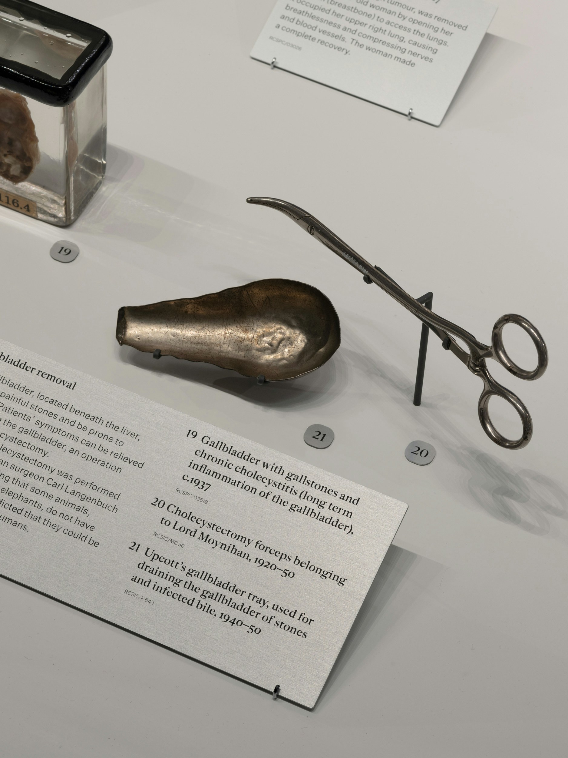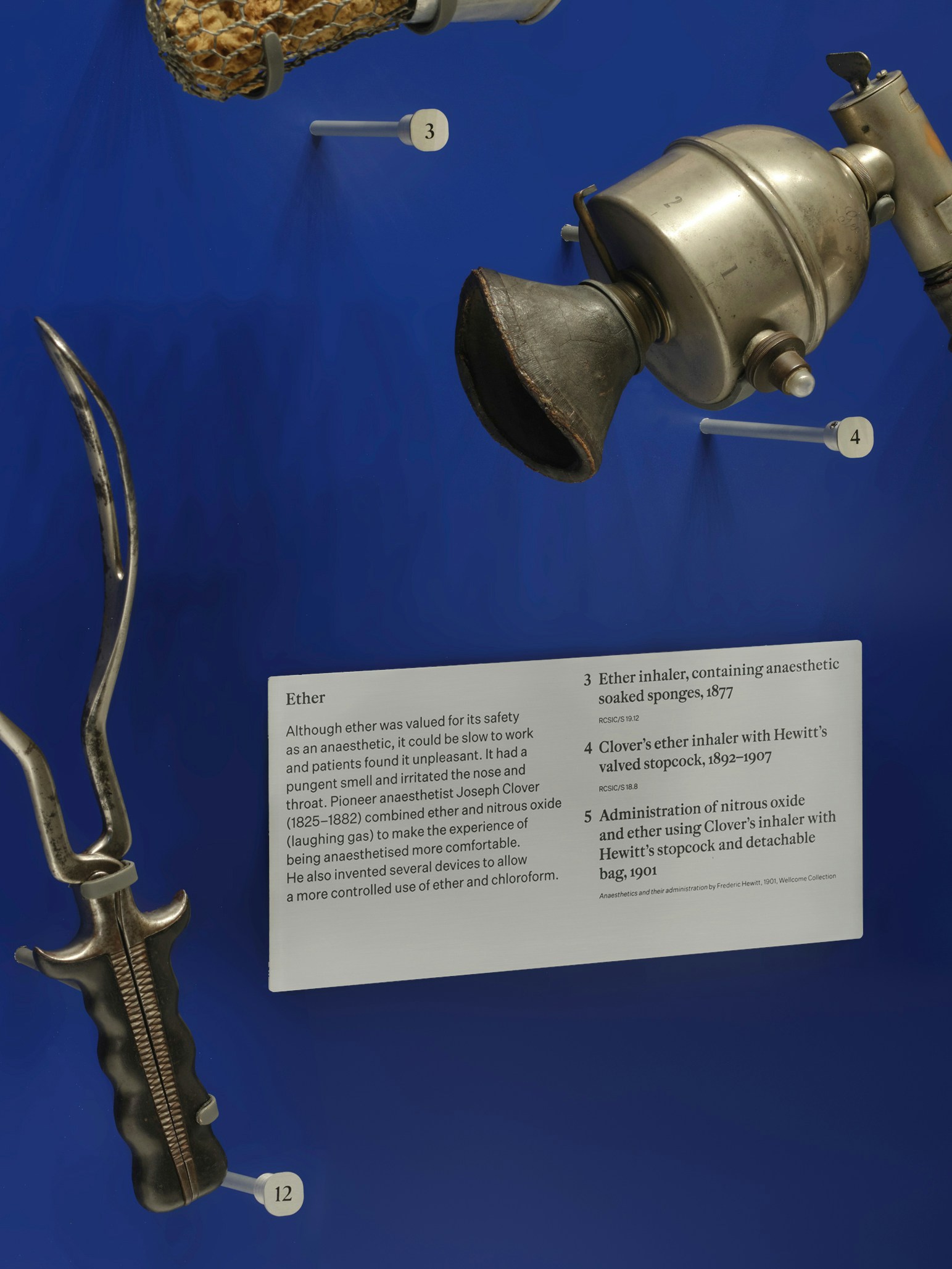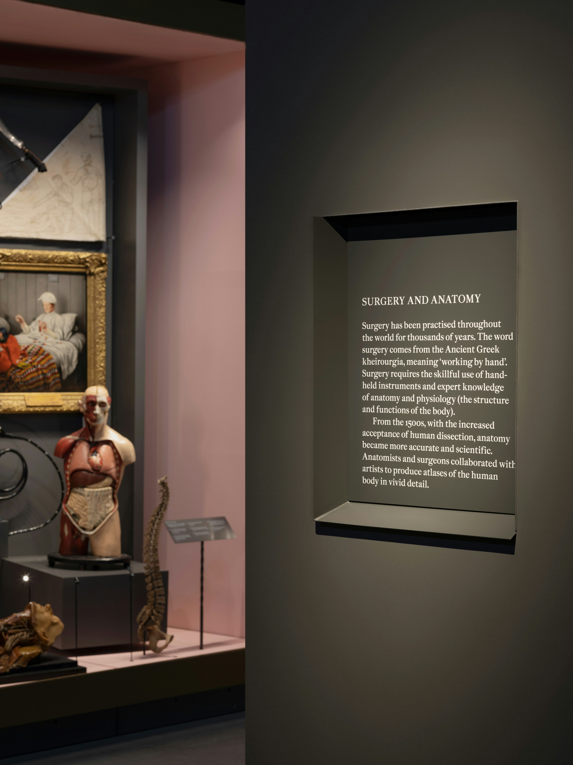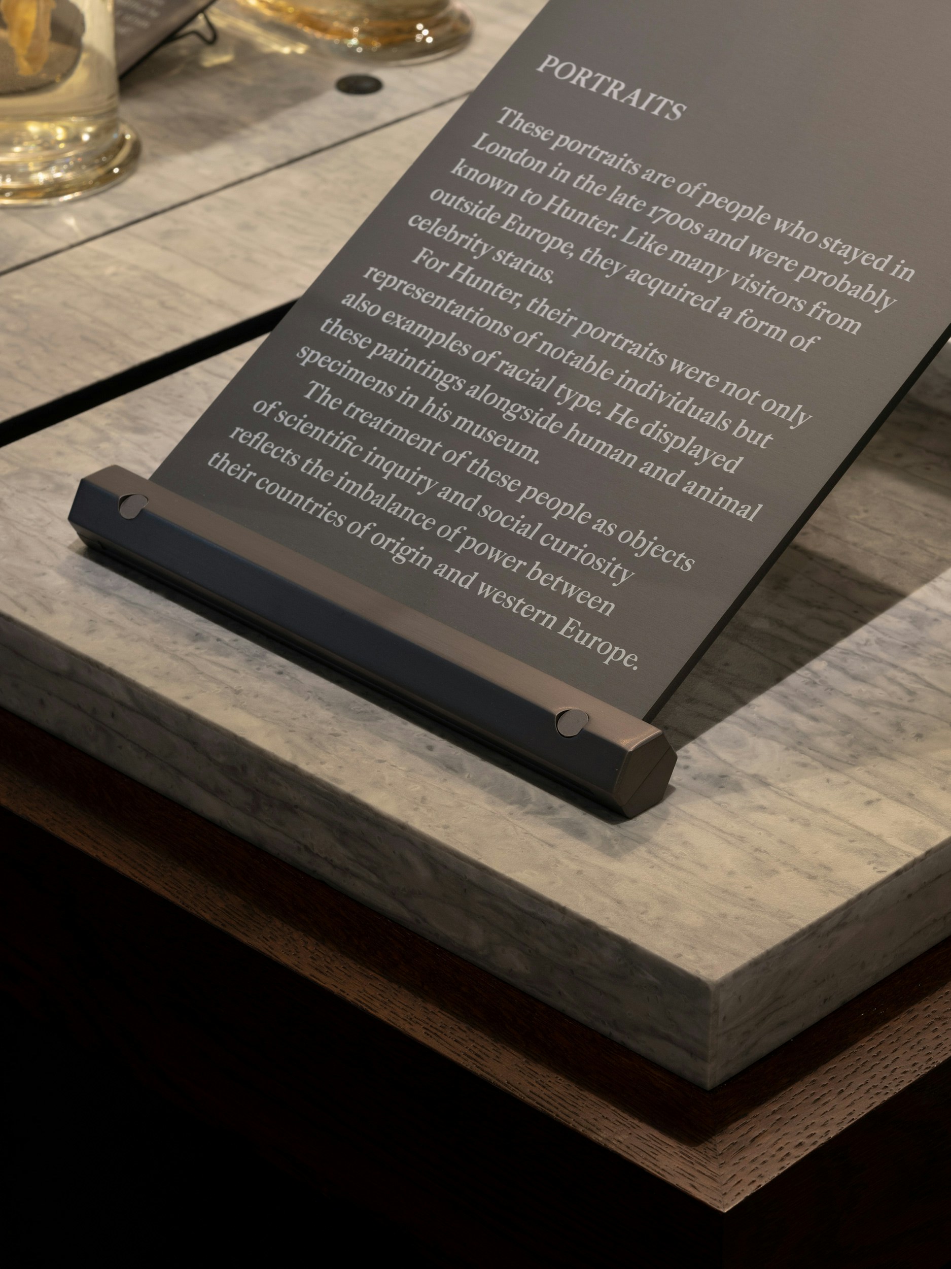 The graphic interpretation system references the forms and materials of surgical instruments and how they developed over time. Faceted, knurled and polished chrome details adorn the armatures holding object labels and text panels in place. A flexible system was devised to individually label and interpret Hunter’s specimen collection of over 2,000 anatomical specimen jars held in the Long Gallery.
