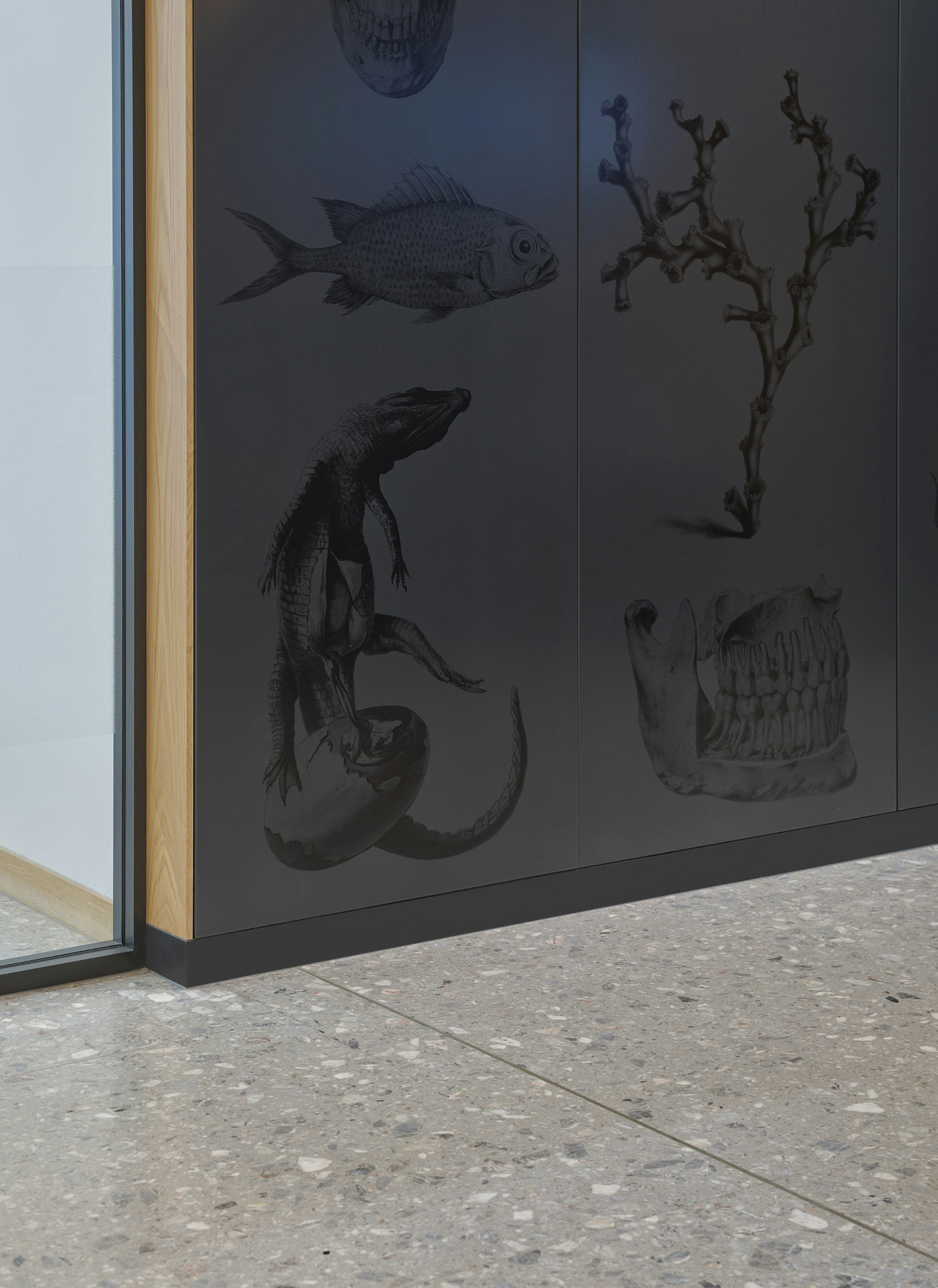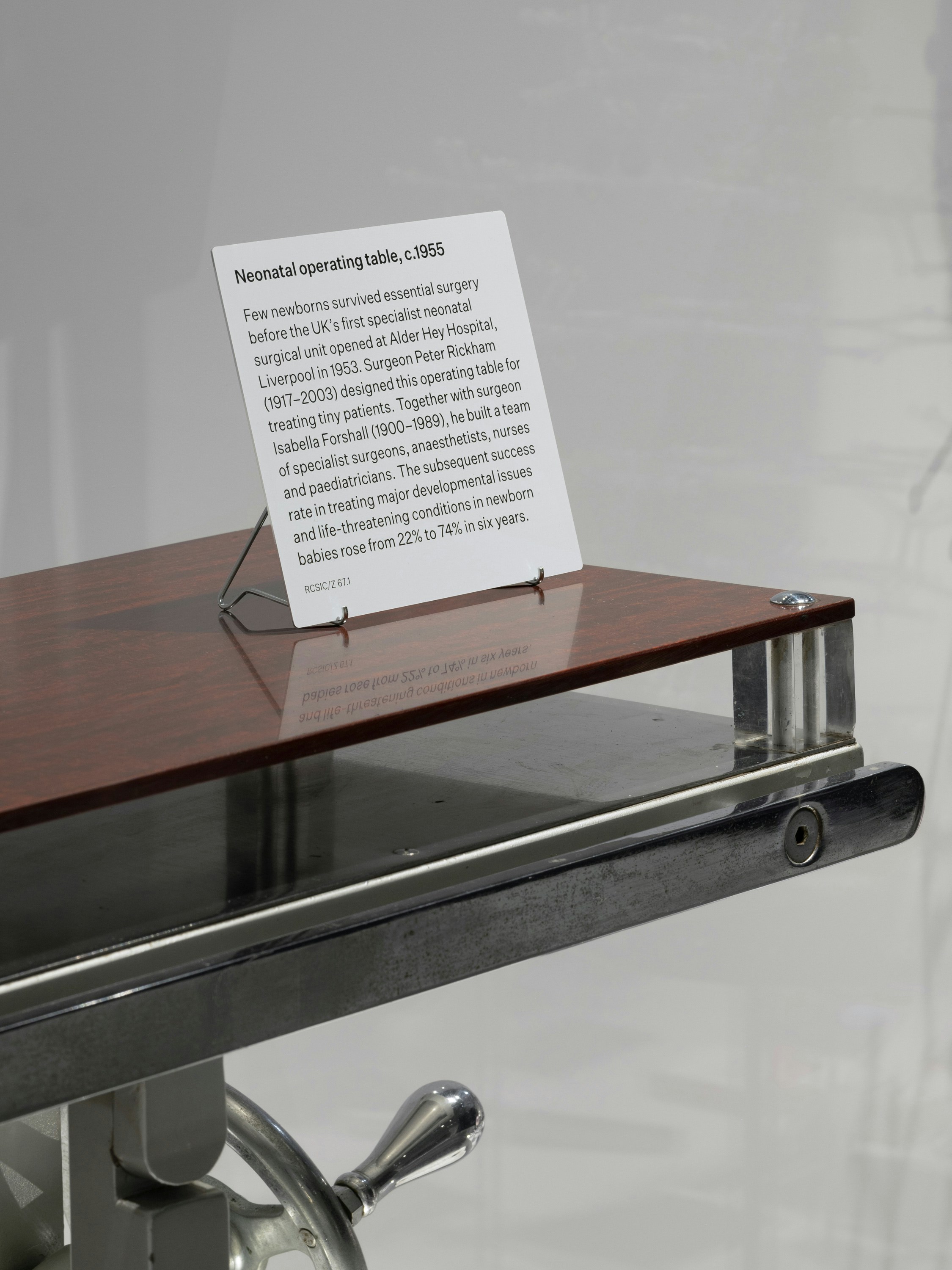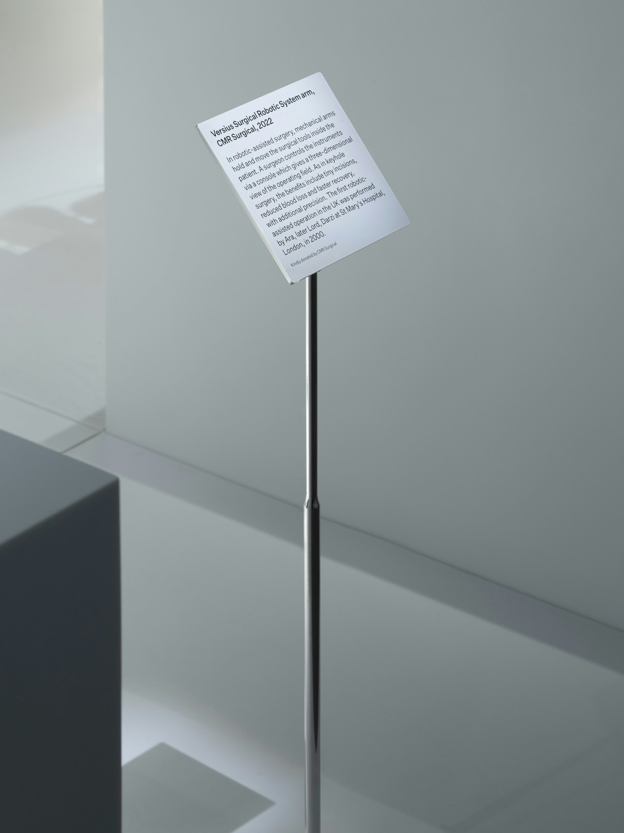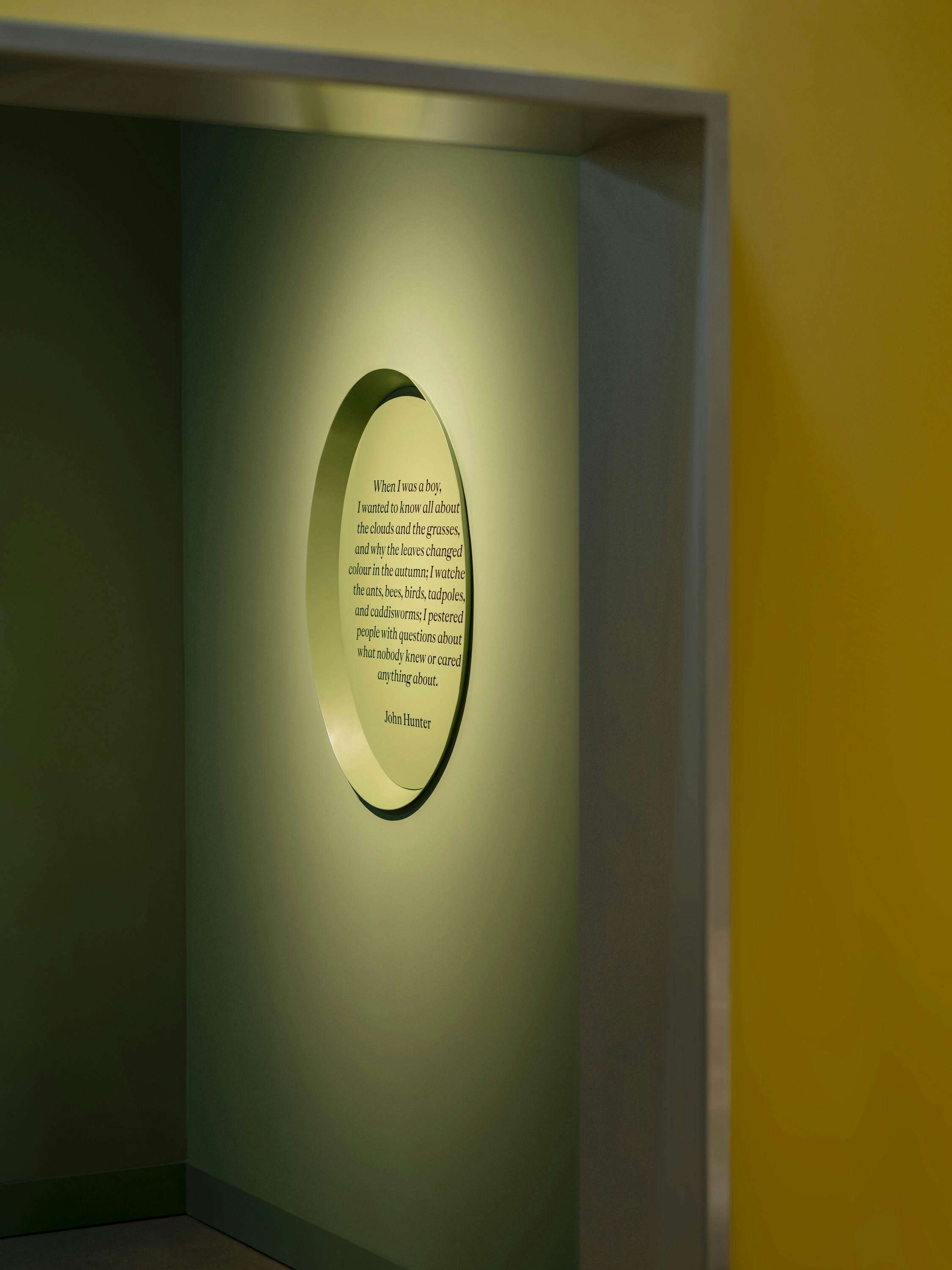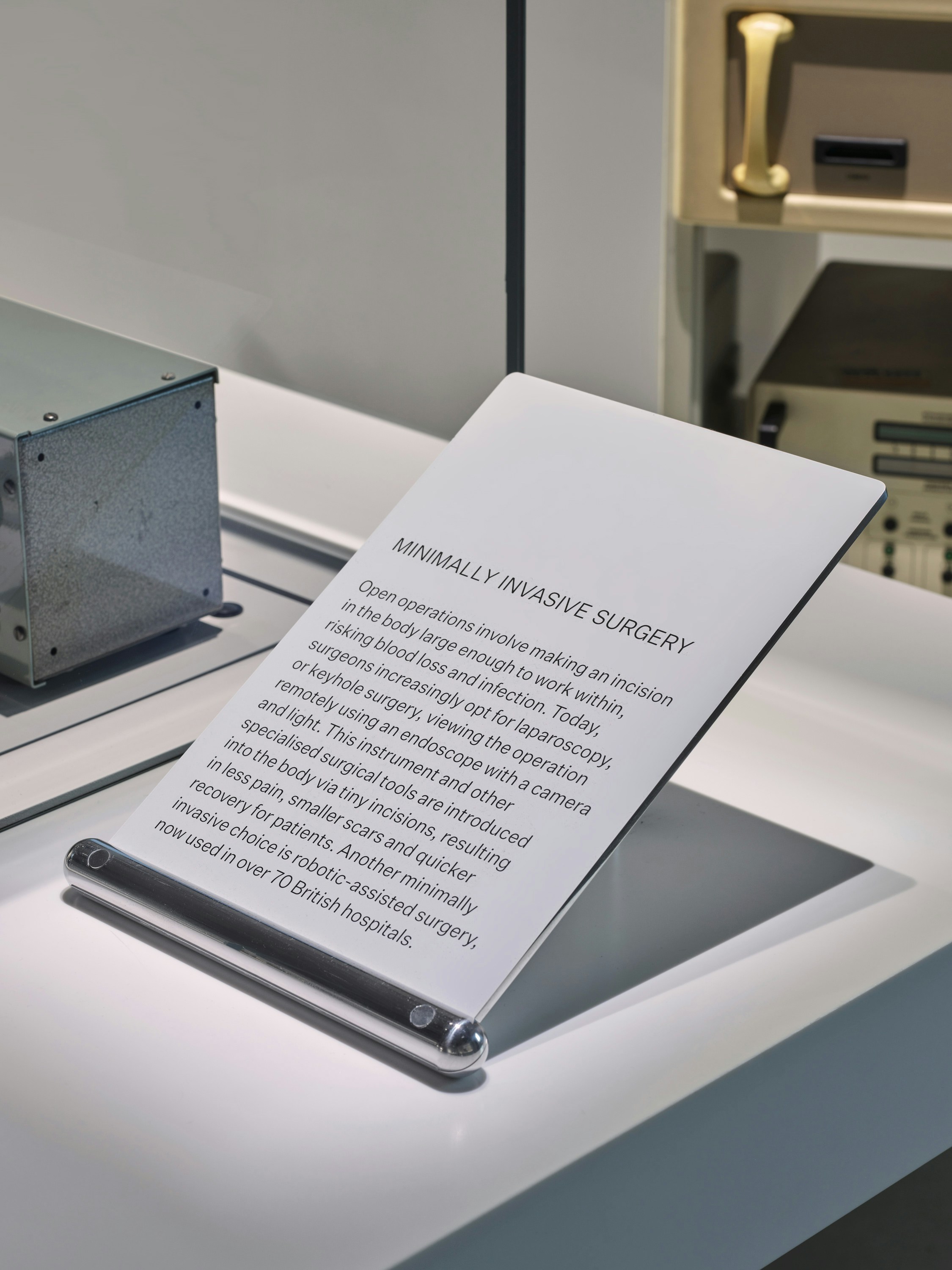 The graphic interpretation system references the forms and materials of surgical instruments and how they developed over time. Faceted, knurled and polished chrome details adorn the armatures holding object labels and text panels in place. A flexible system was devised to individually label and interpret Hunter’s specimen collection of over 2,000 anatomical specimen jars held in the Long Gallery.