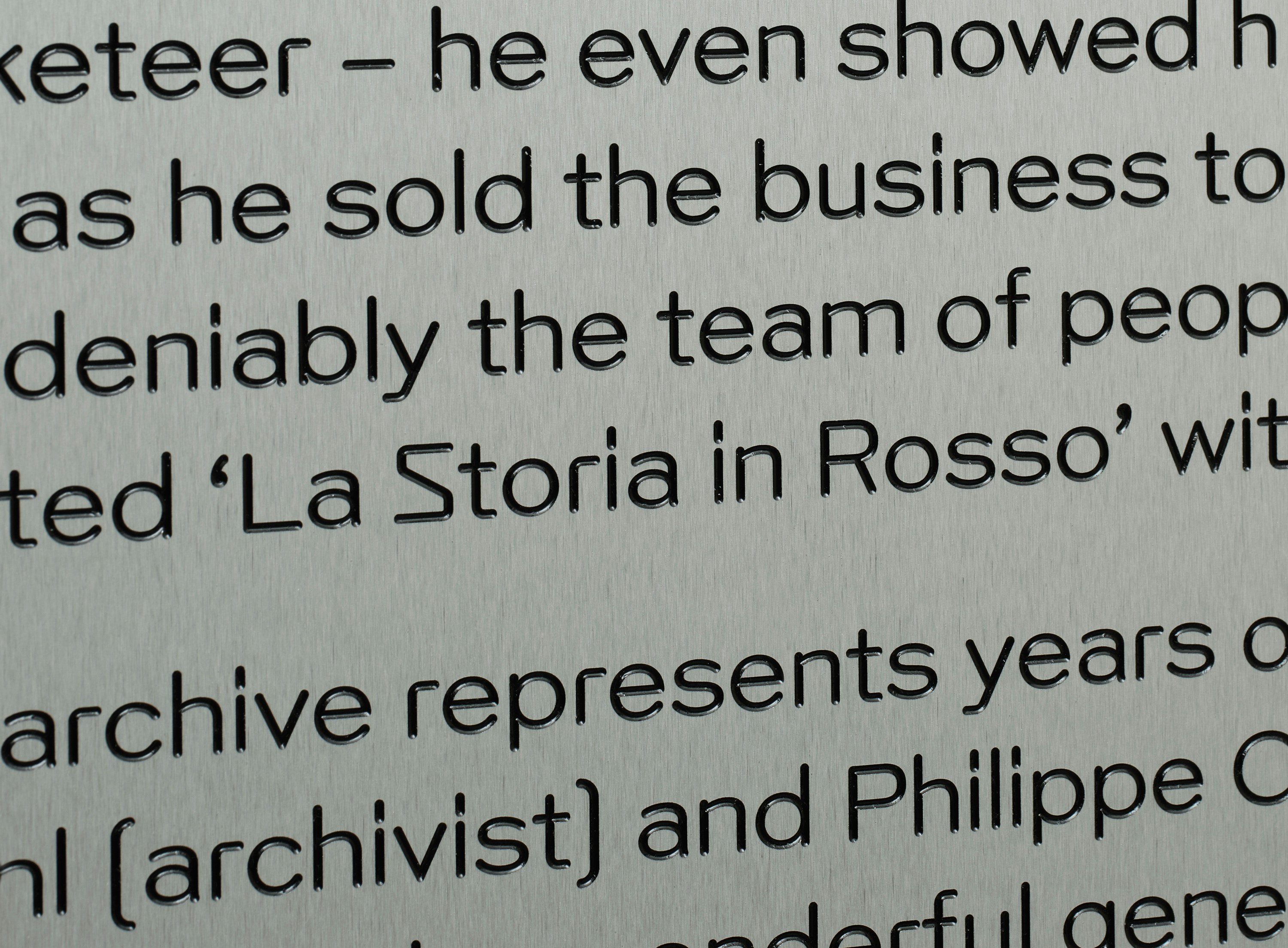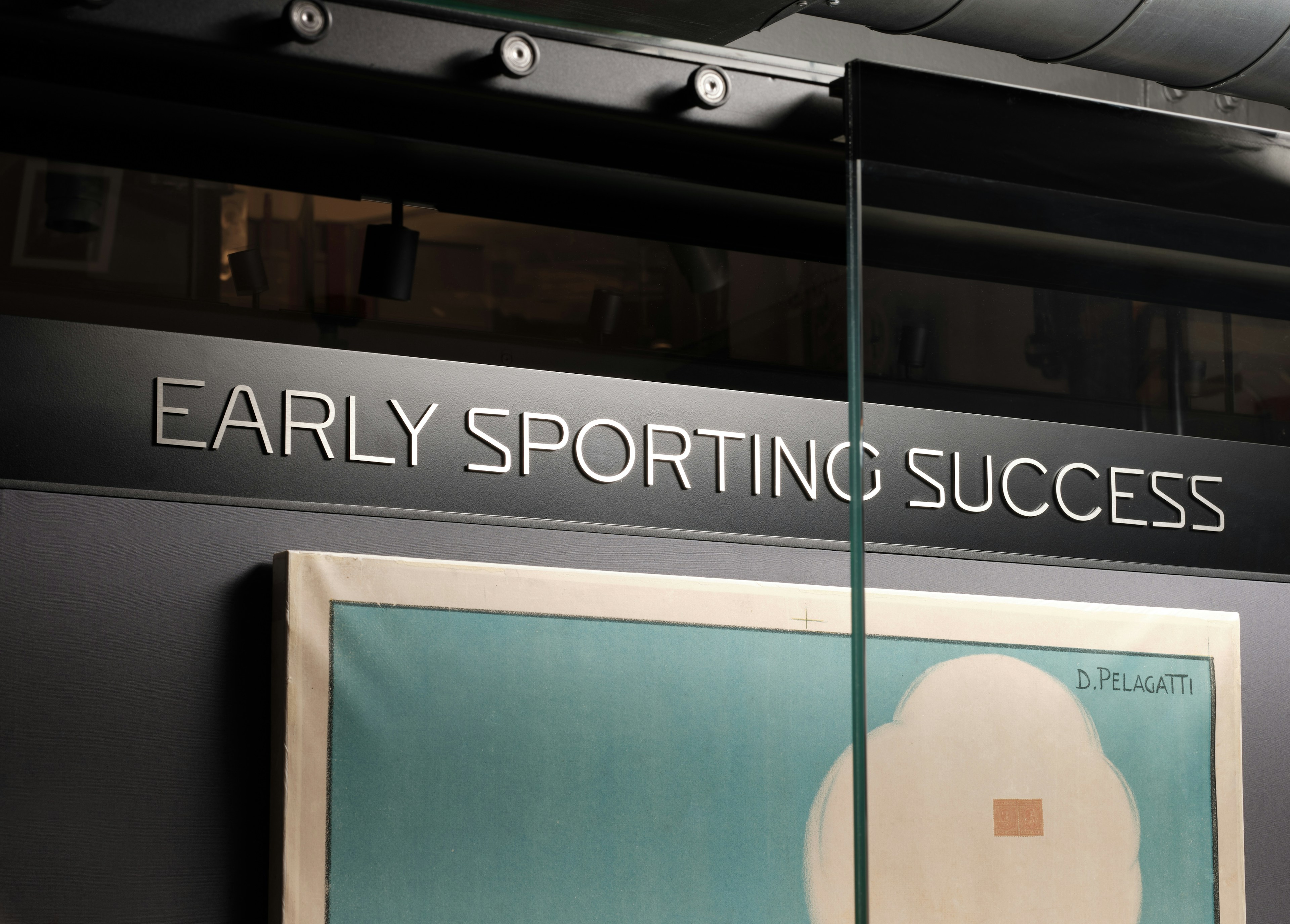DPM created the graphic identity working with typographic designer Alaric Garnier. The word marque is inspired by early 20th century Italian condensed letterforms found within the archive. This is paired with a bespoke monoline typeface that references typography found in engineering drawings, engraved machine parts and trophies. The identity also includes a monogram – recalling the tradition of motorsport emblems.