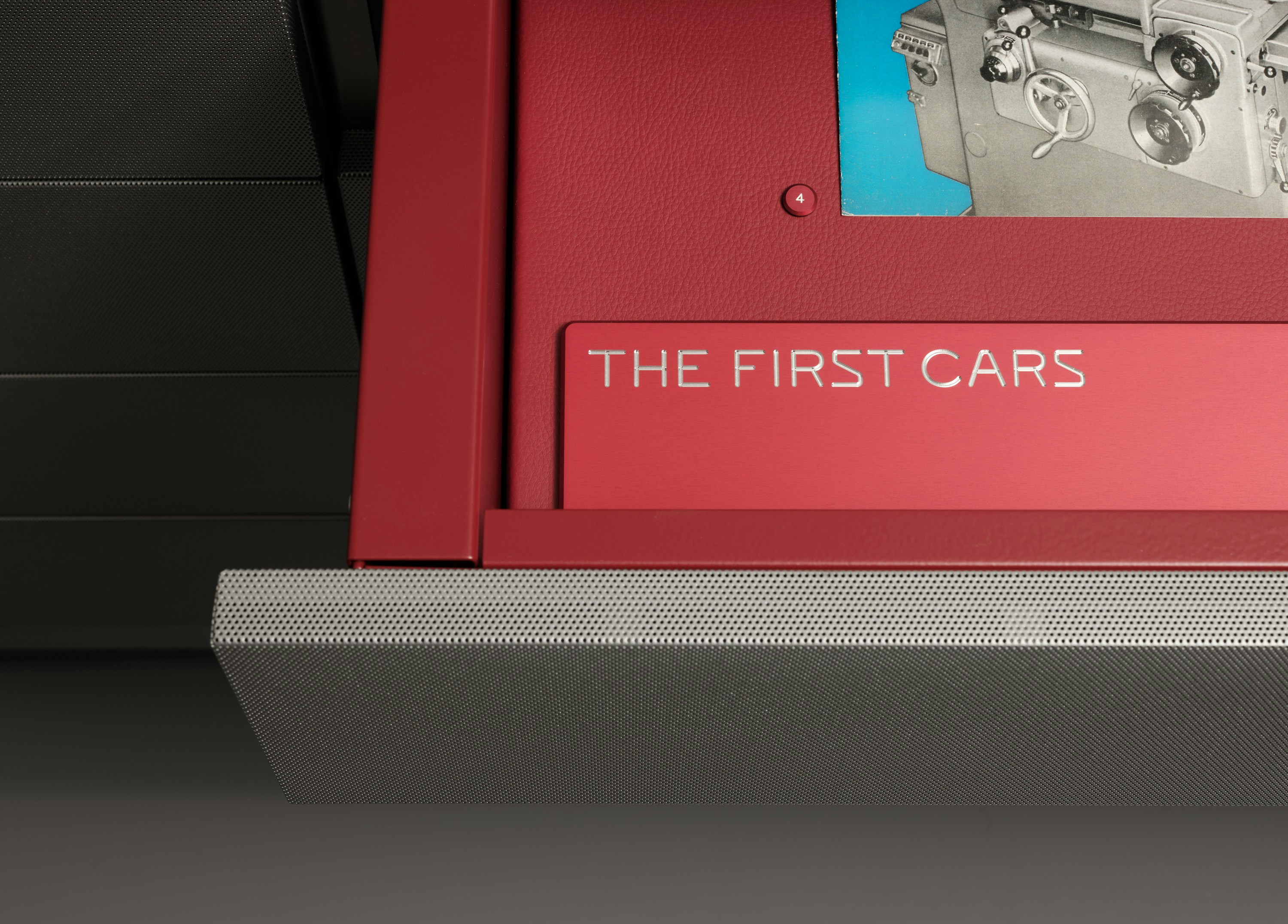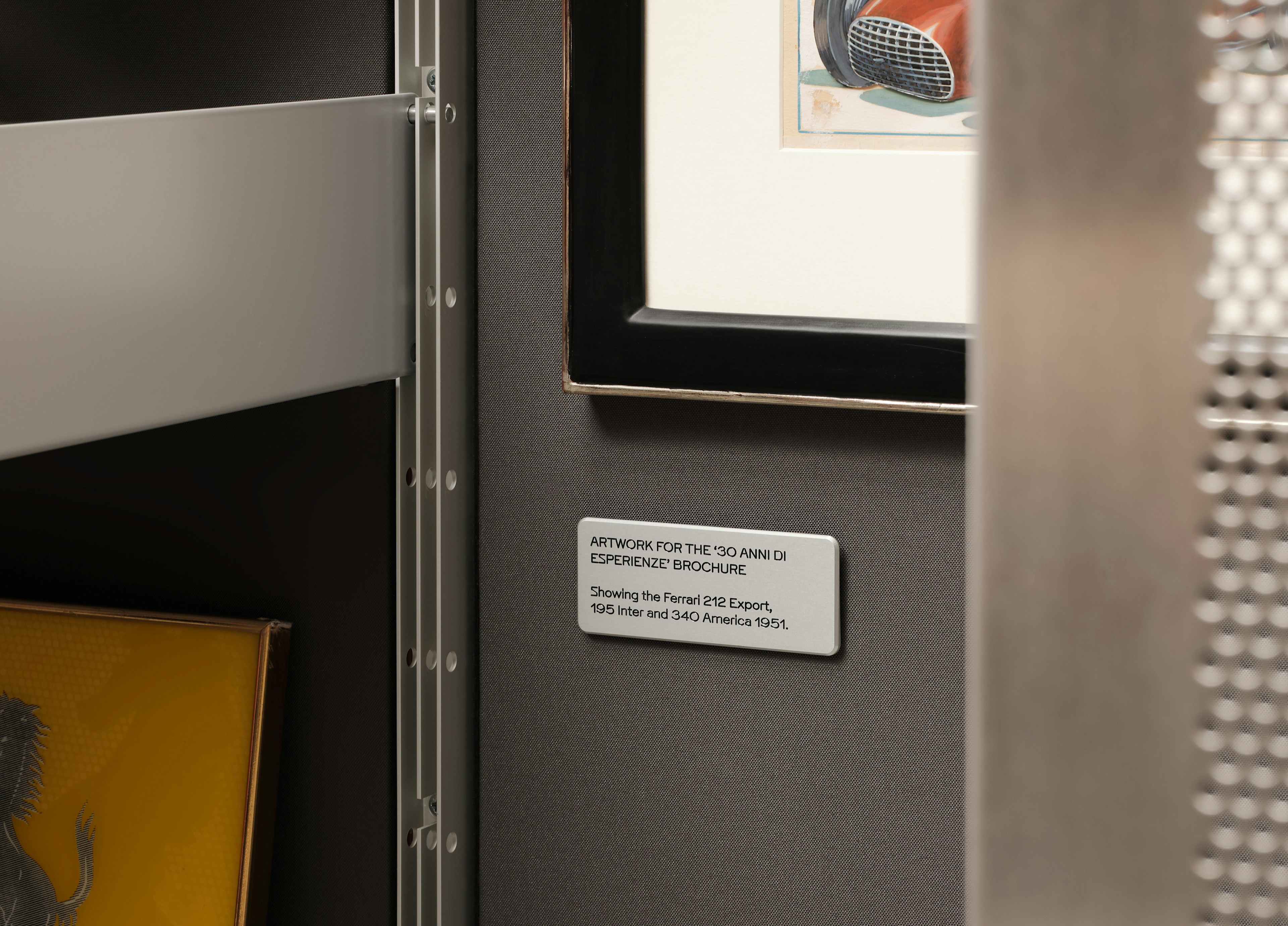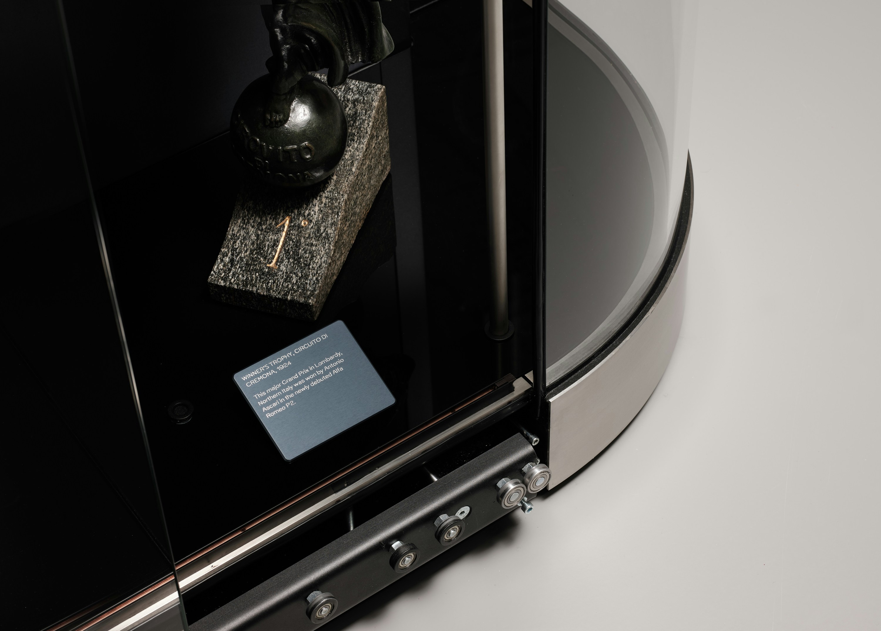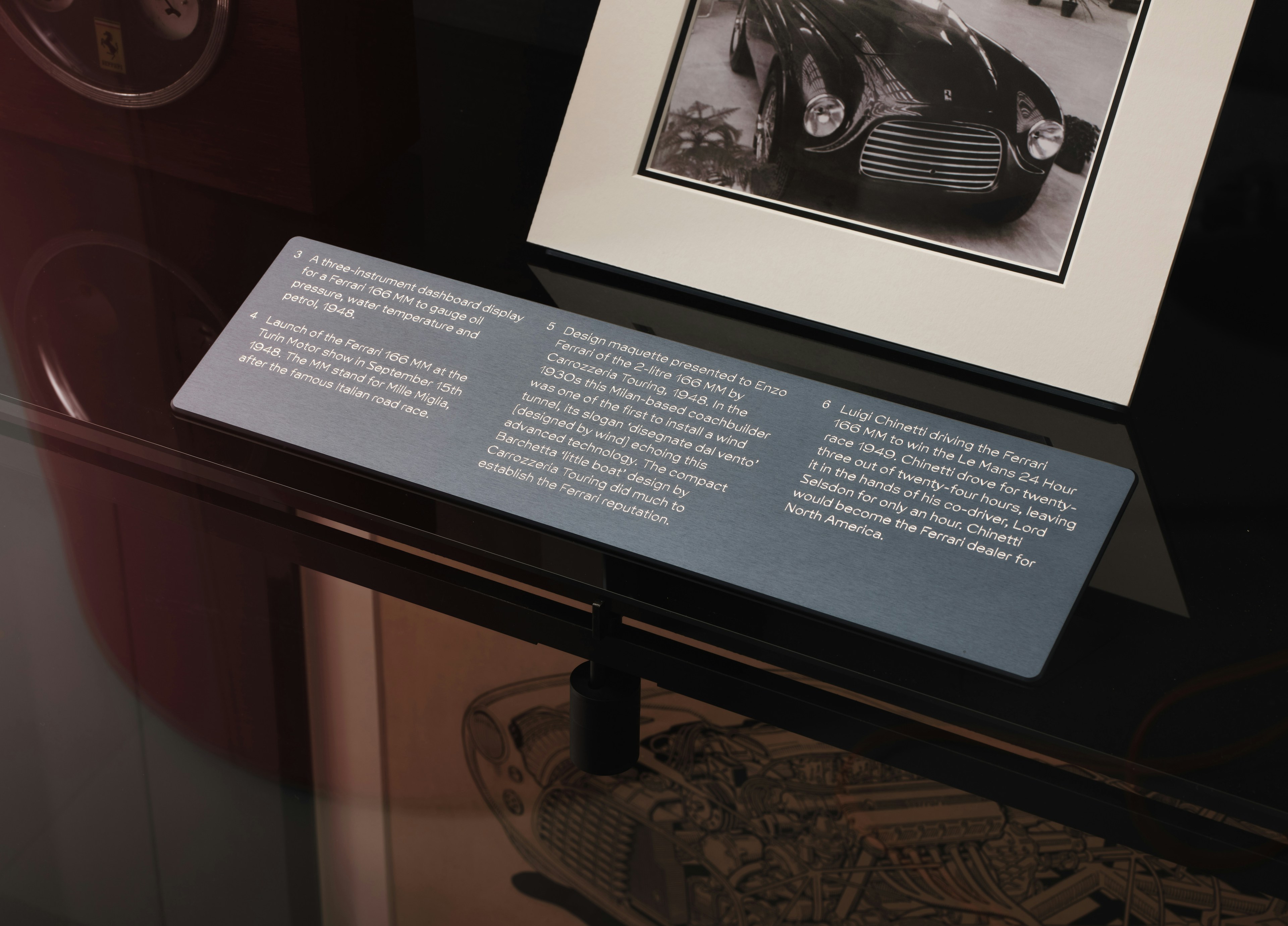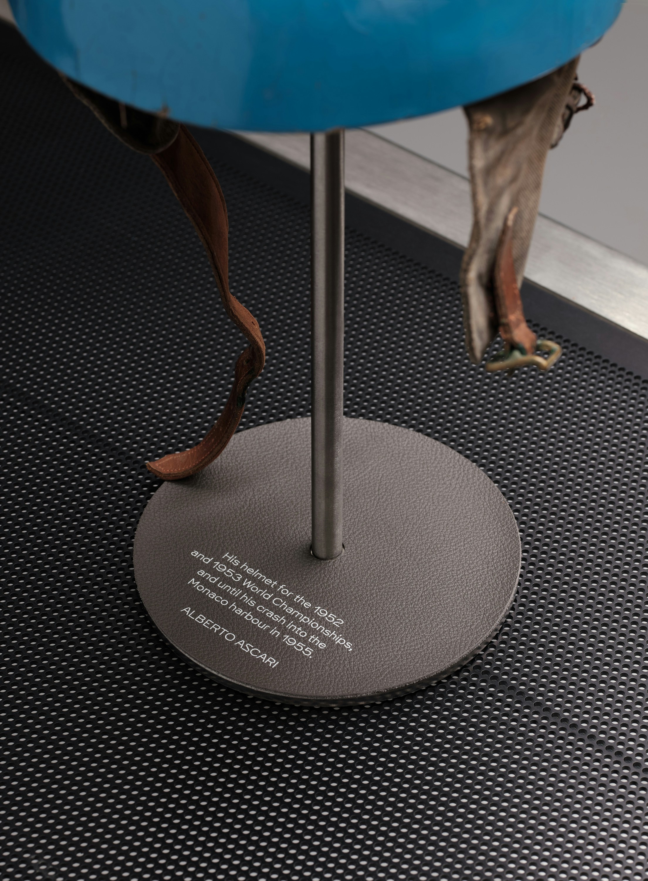 Coloured anodised aluminium labels and panels were engraved to utilise the characteristics of the monoline typeface and underline its connection to the objects. A collection of racing helmets are labelled with printed leather discs that sit below.