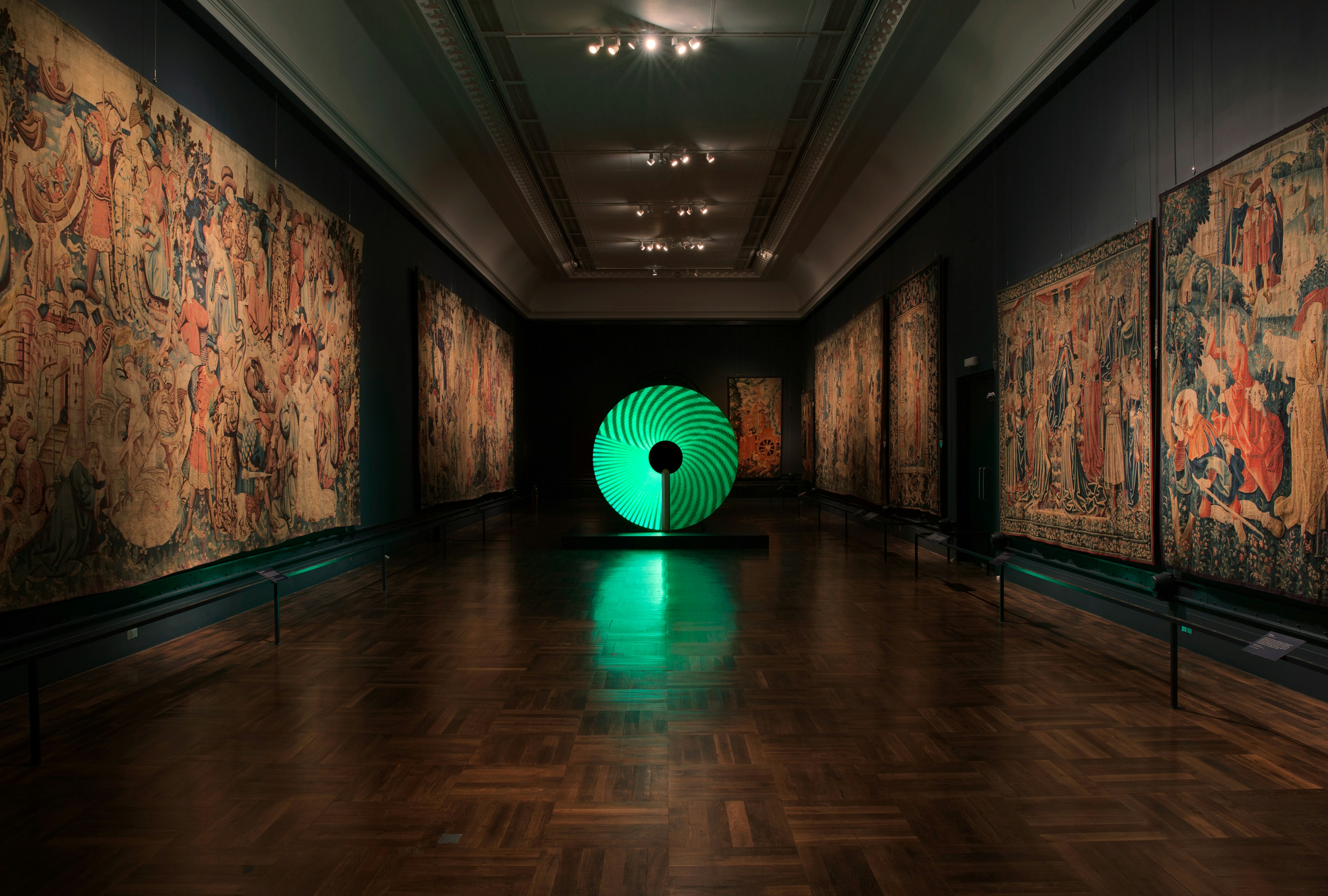 The term ‘Candela’ comes from the standard unit of luminous intensity: a common candle emits light with a luminous intensity of roughly one candela. Displayed in the V&A’s darkest space, the Tapestry Gallery, the installation experiments with the luminescent properties of Super-LumiNova a material used on the dials of wrist watches.