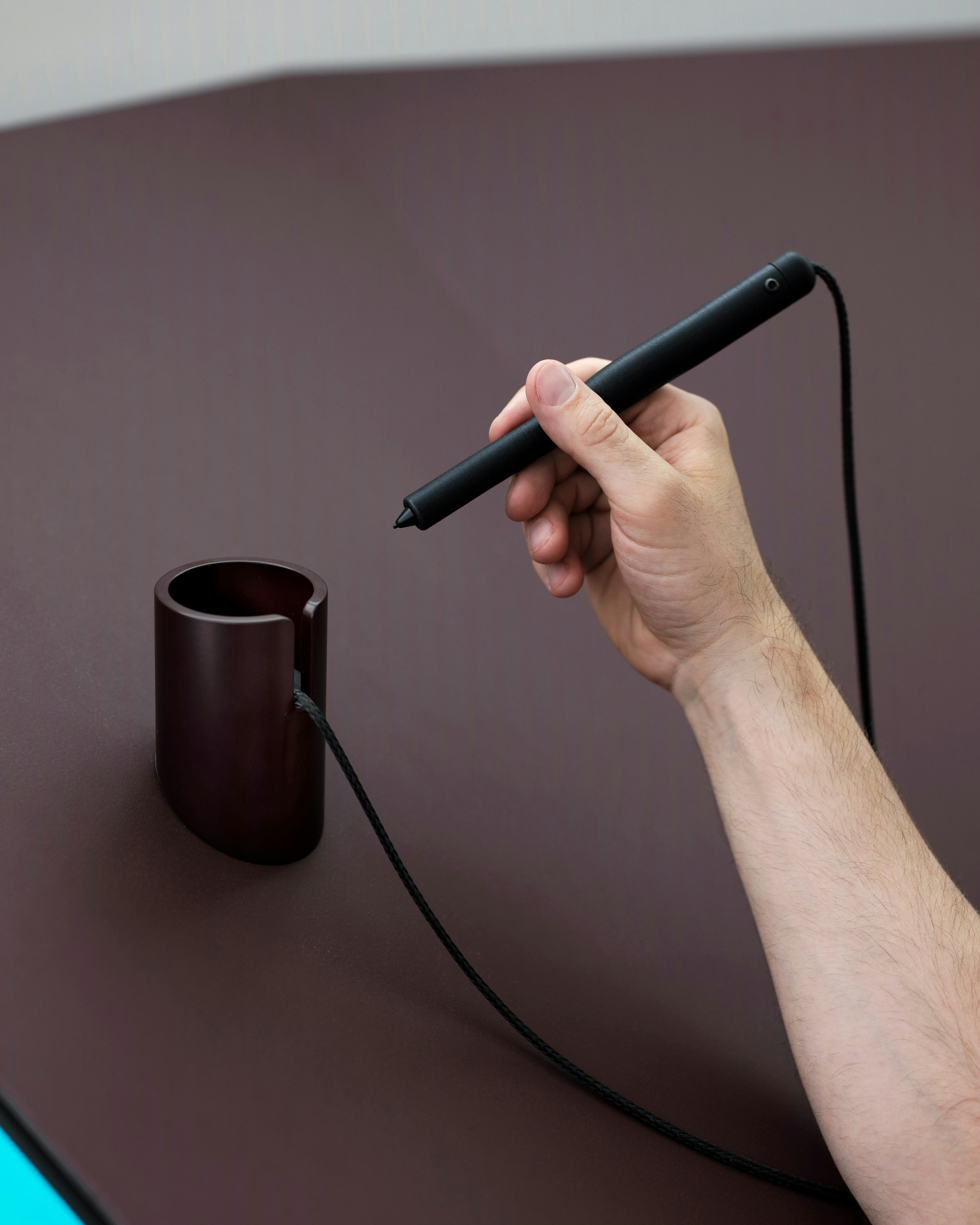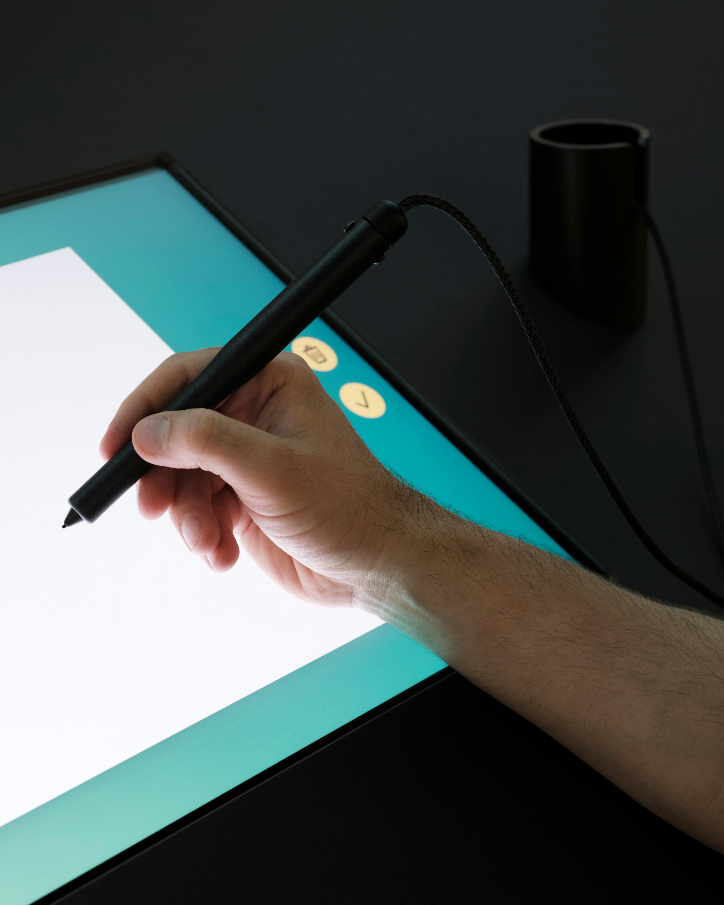 A bespoke housing was designed for the stylus pen to increase its durability, improve grip for smaller users and tether it to the furniture safely.
