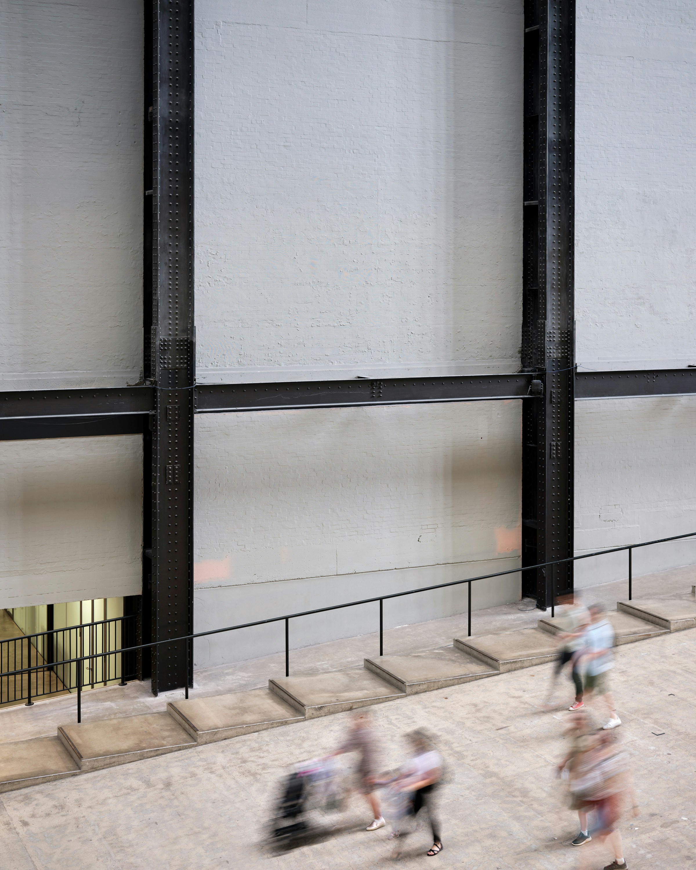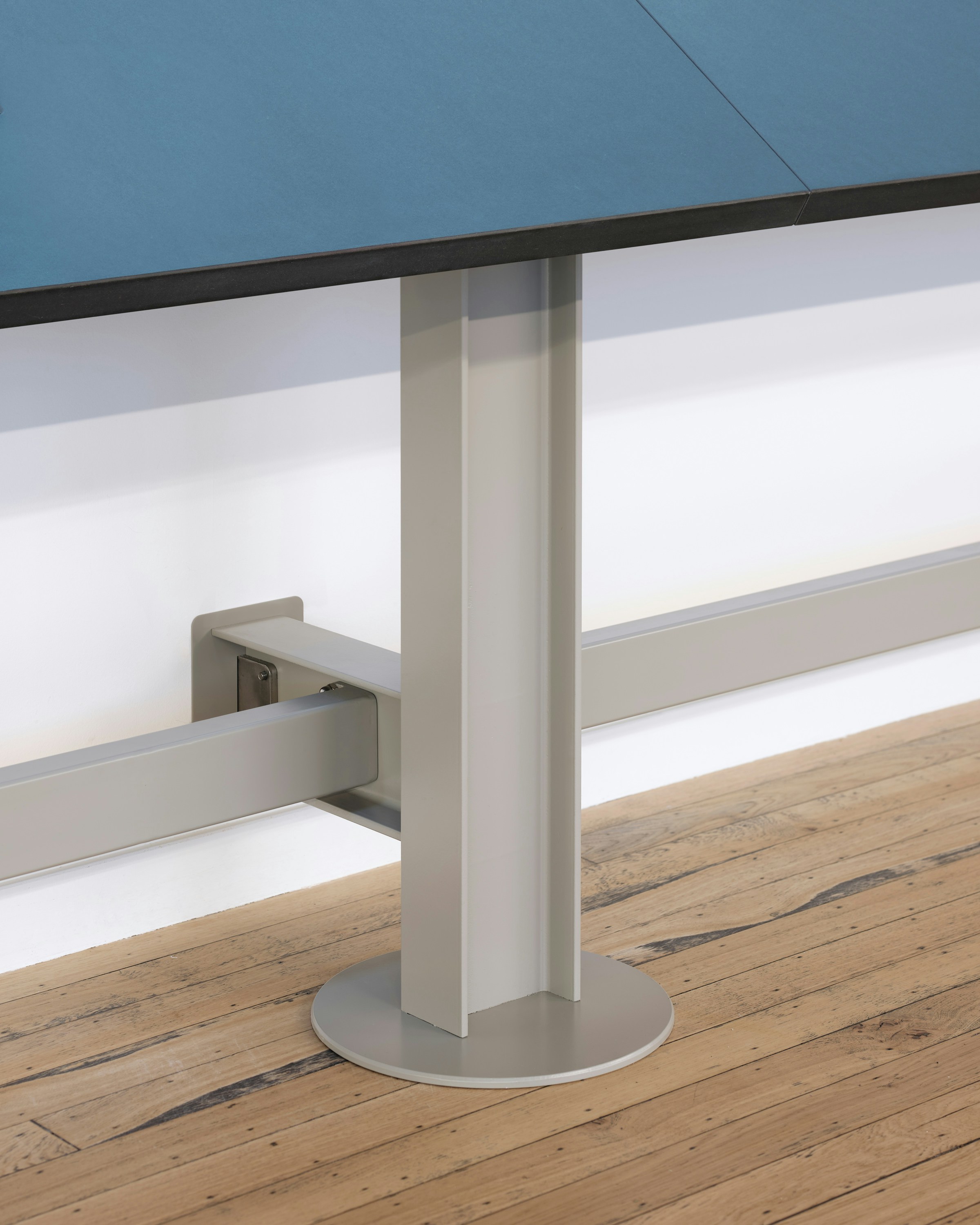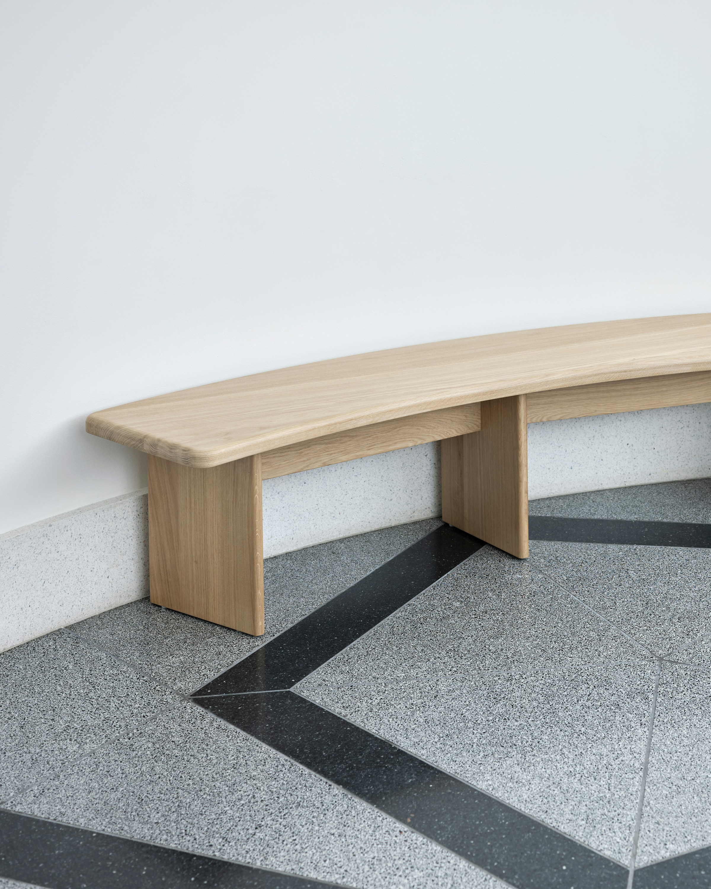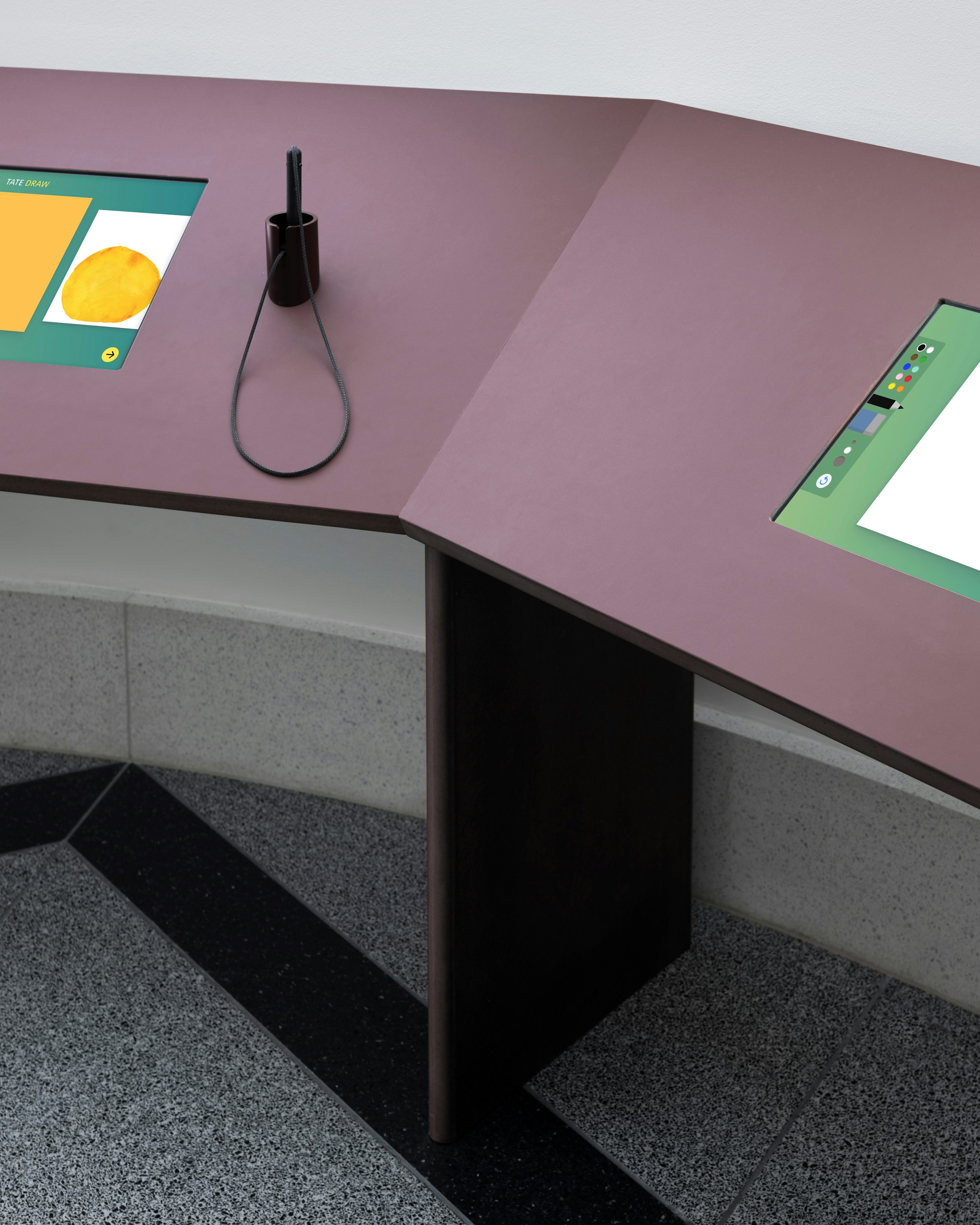 At Tate Modern the angled tables were supported by steel beams referencing the construction of the Turbine Hall. The drum-shaped room at Tate Britain led to a faceted table, this was combined with a curved oak bench for spectator seating. Both sites use a linoleum worktop that is soft to the touch and hardwearing.