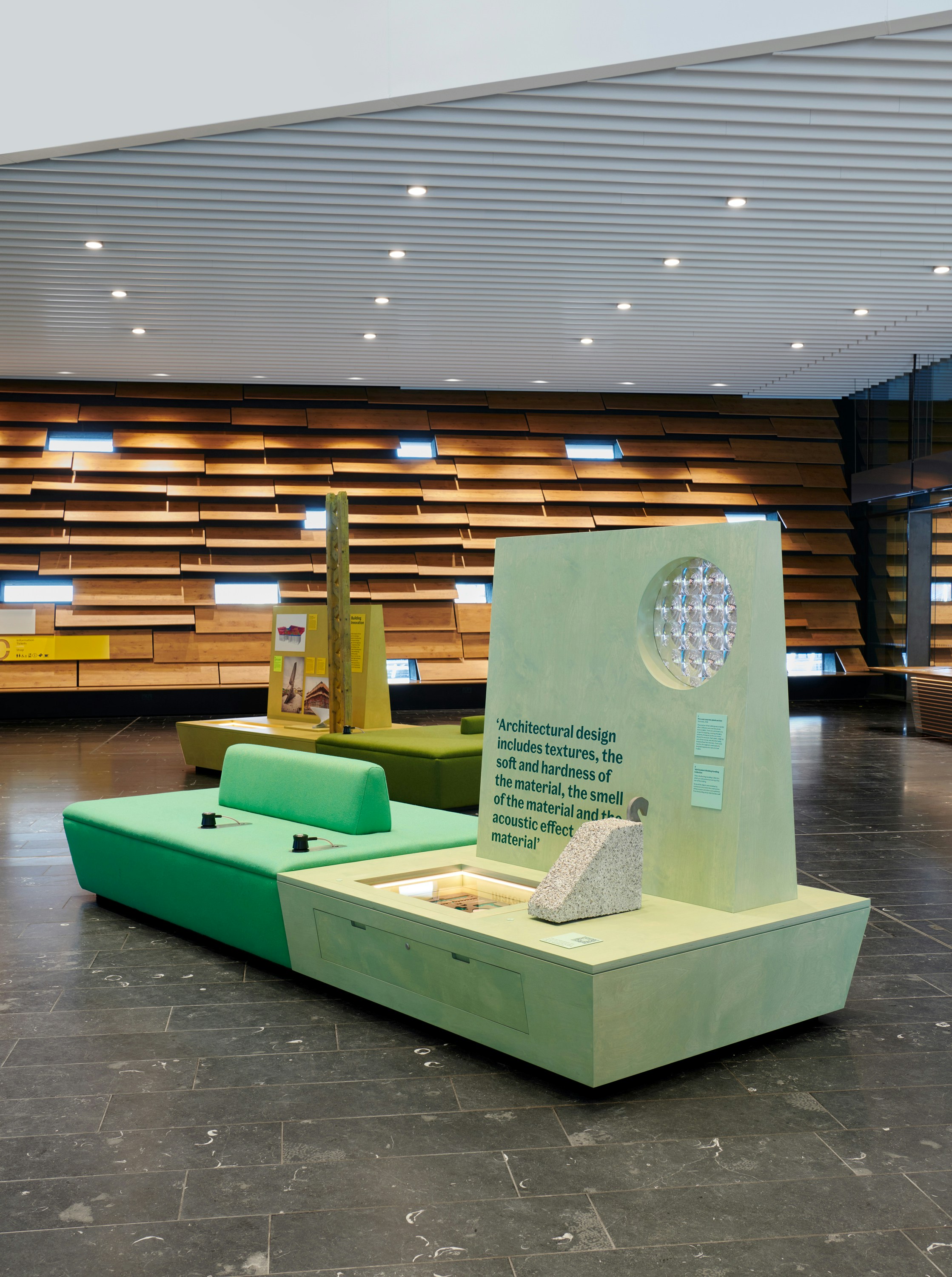 The form of the exhibition furniture references the work of Kenzō Tange a Japanese architect who influenced V&A Dundee’s architect Kengo Kuma.
