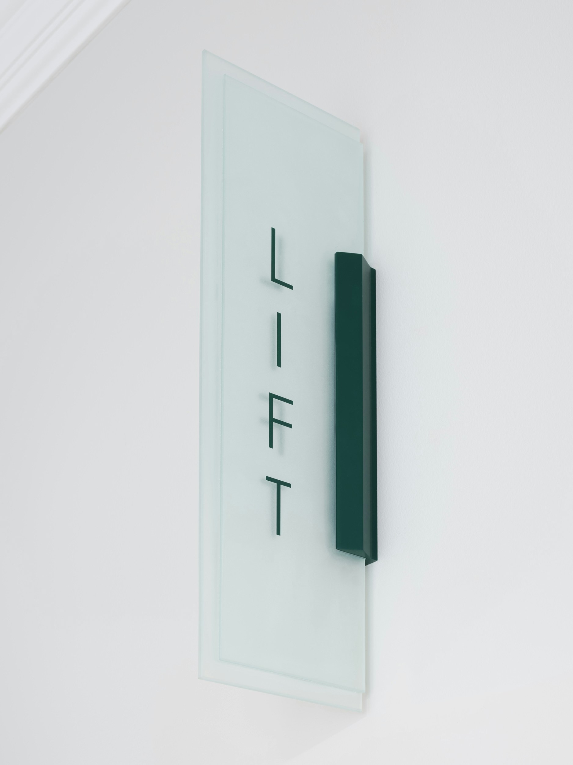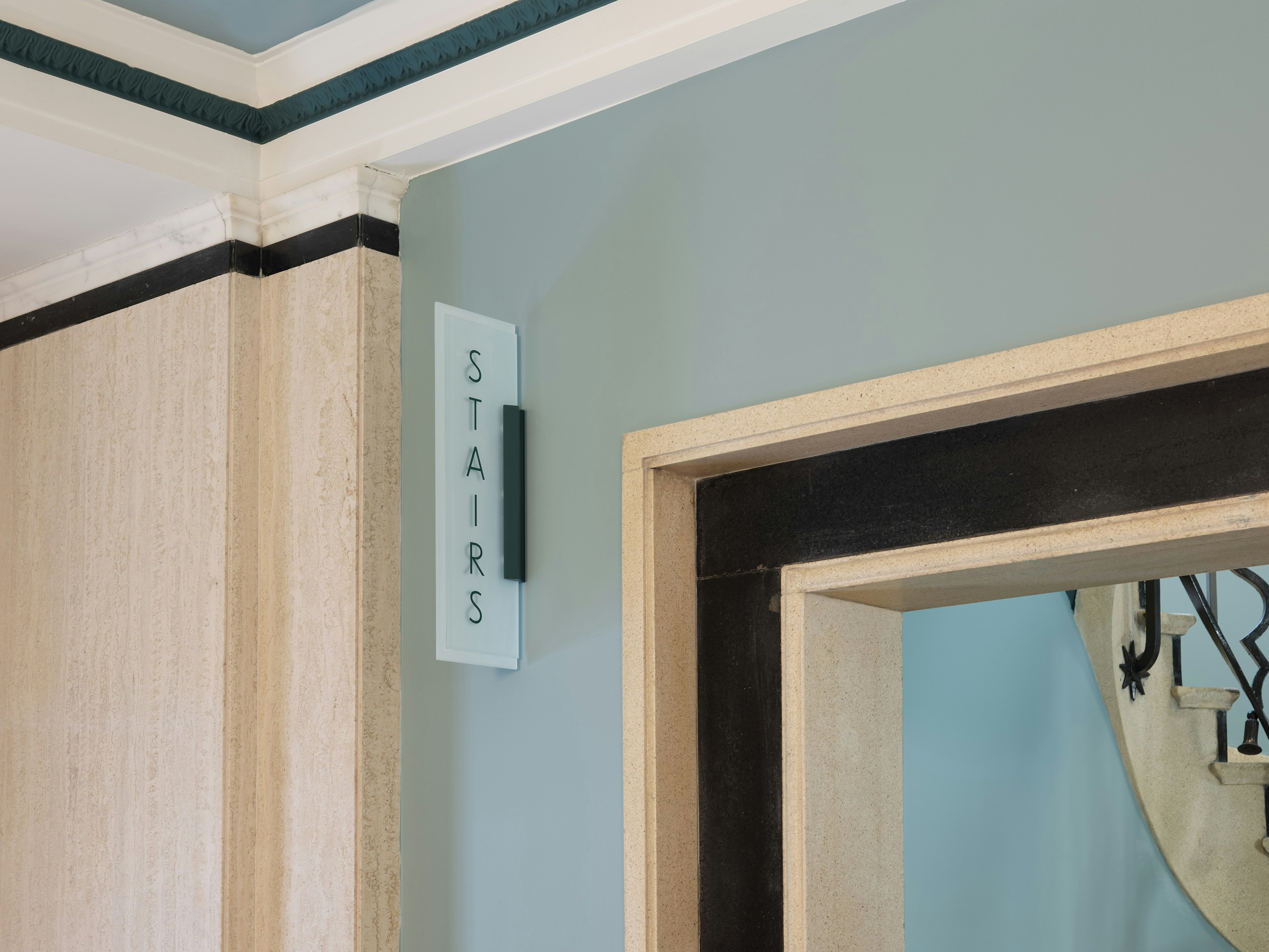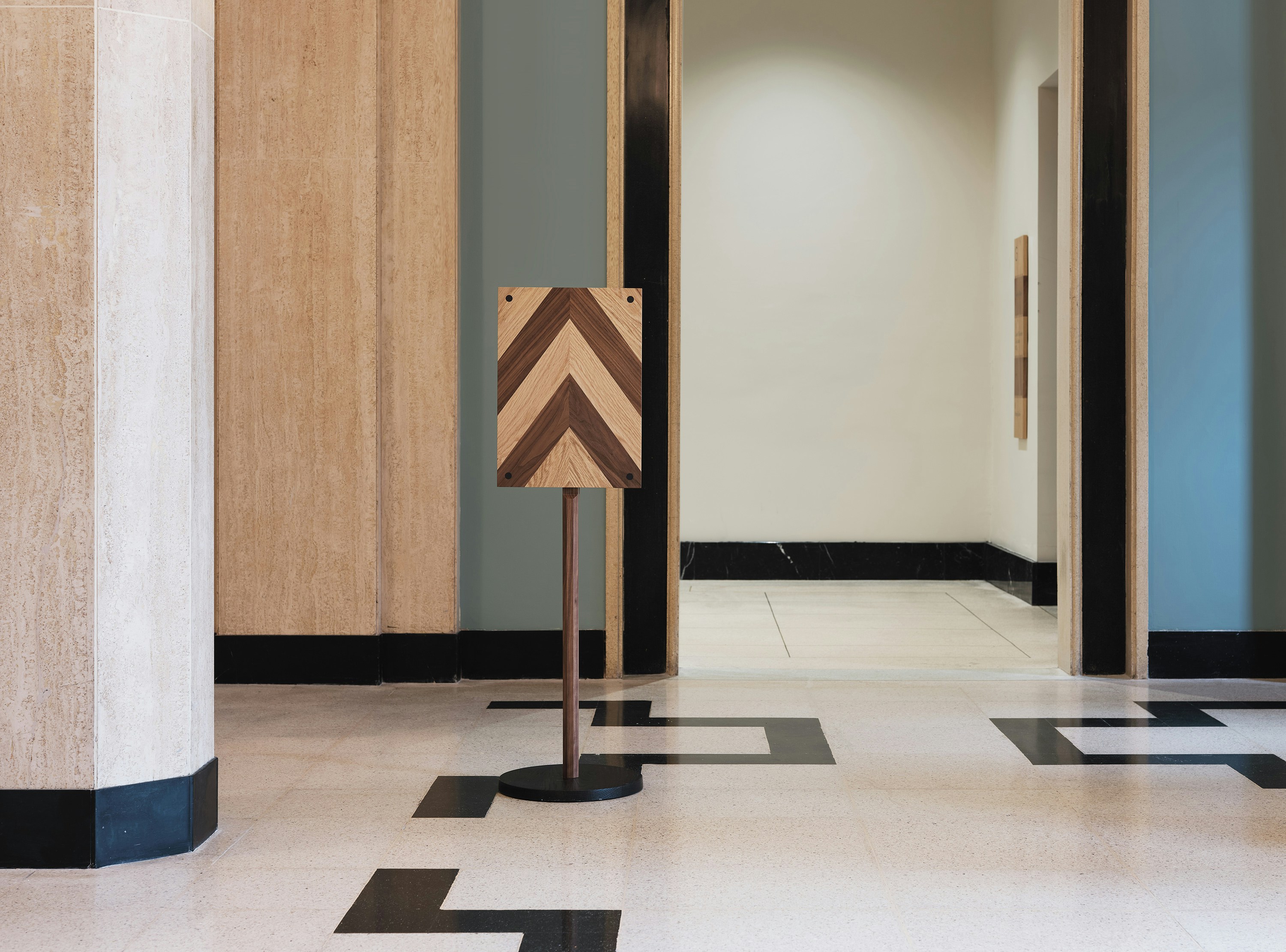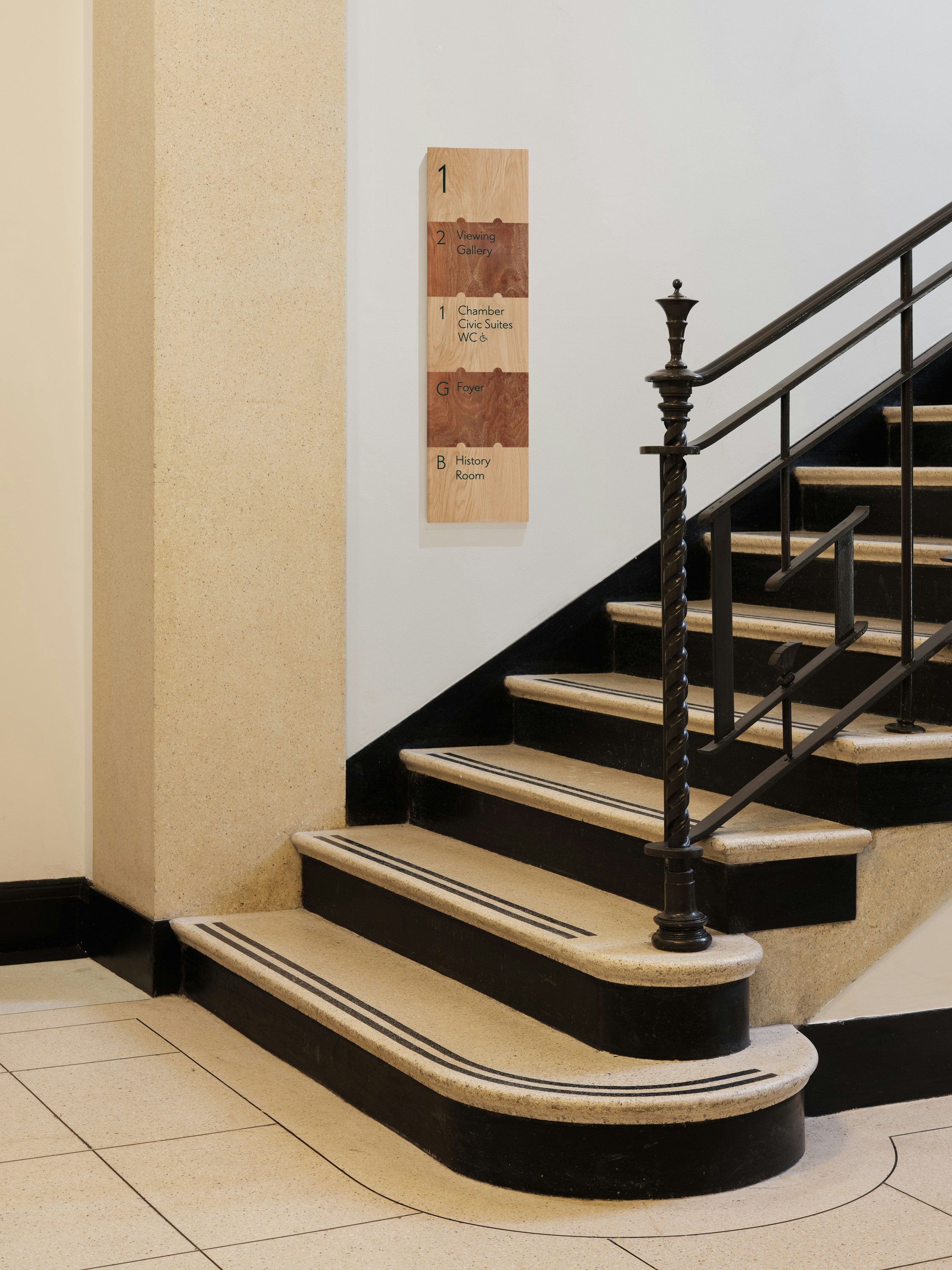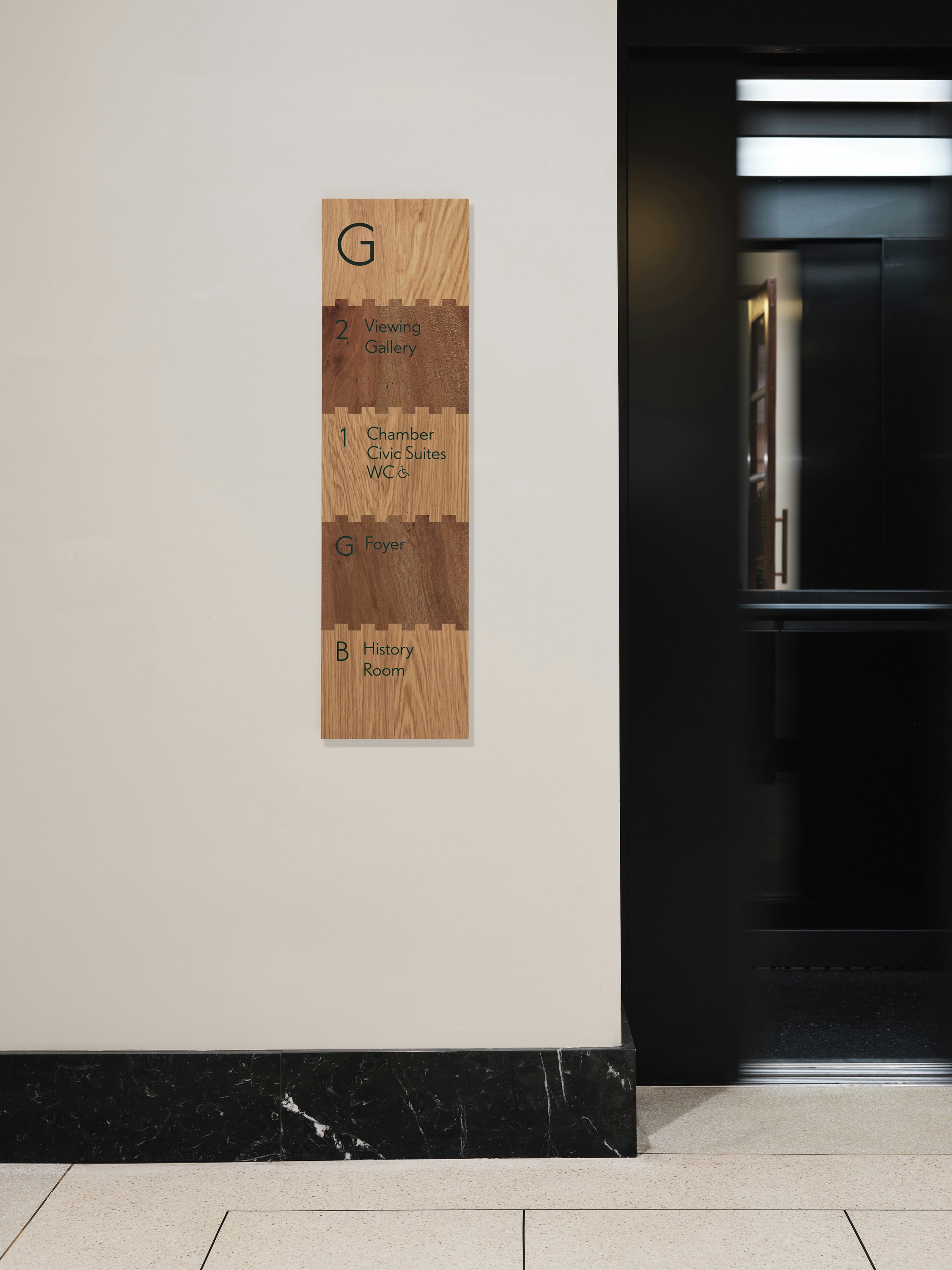 Constructed during World War II, the art deco interiors were panelled with wood veneer salvaged from bomb damaged buildings. DPM developed a sympathetic signage and way-finding scheme that plays off the use of multiple species of wood and references art deco features without creating pastiche facsimiles.