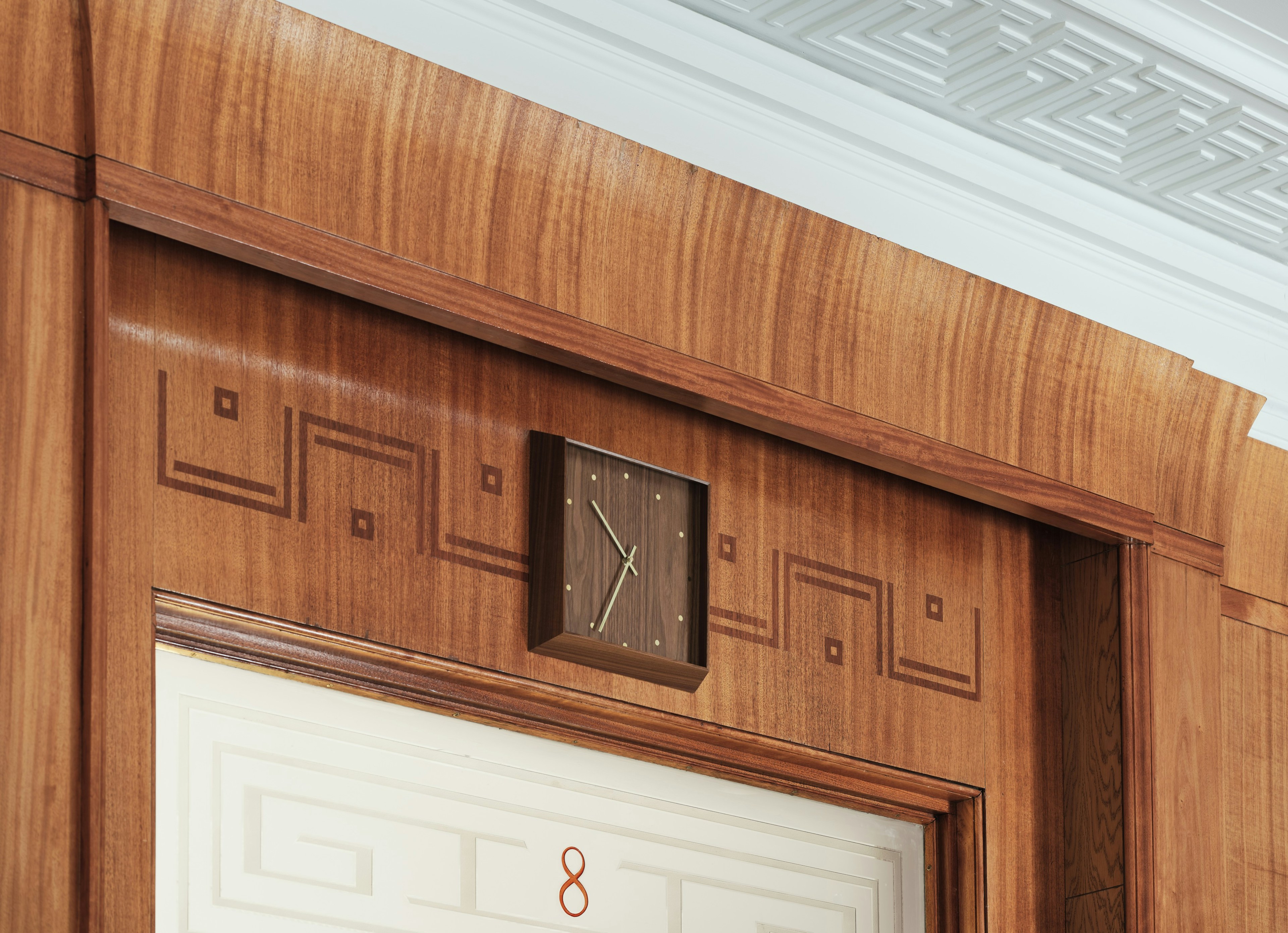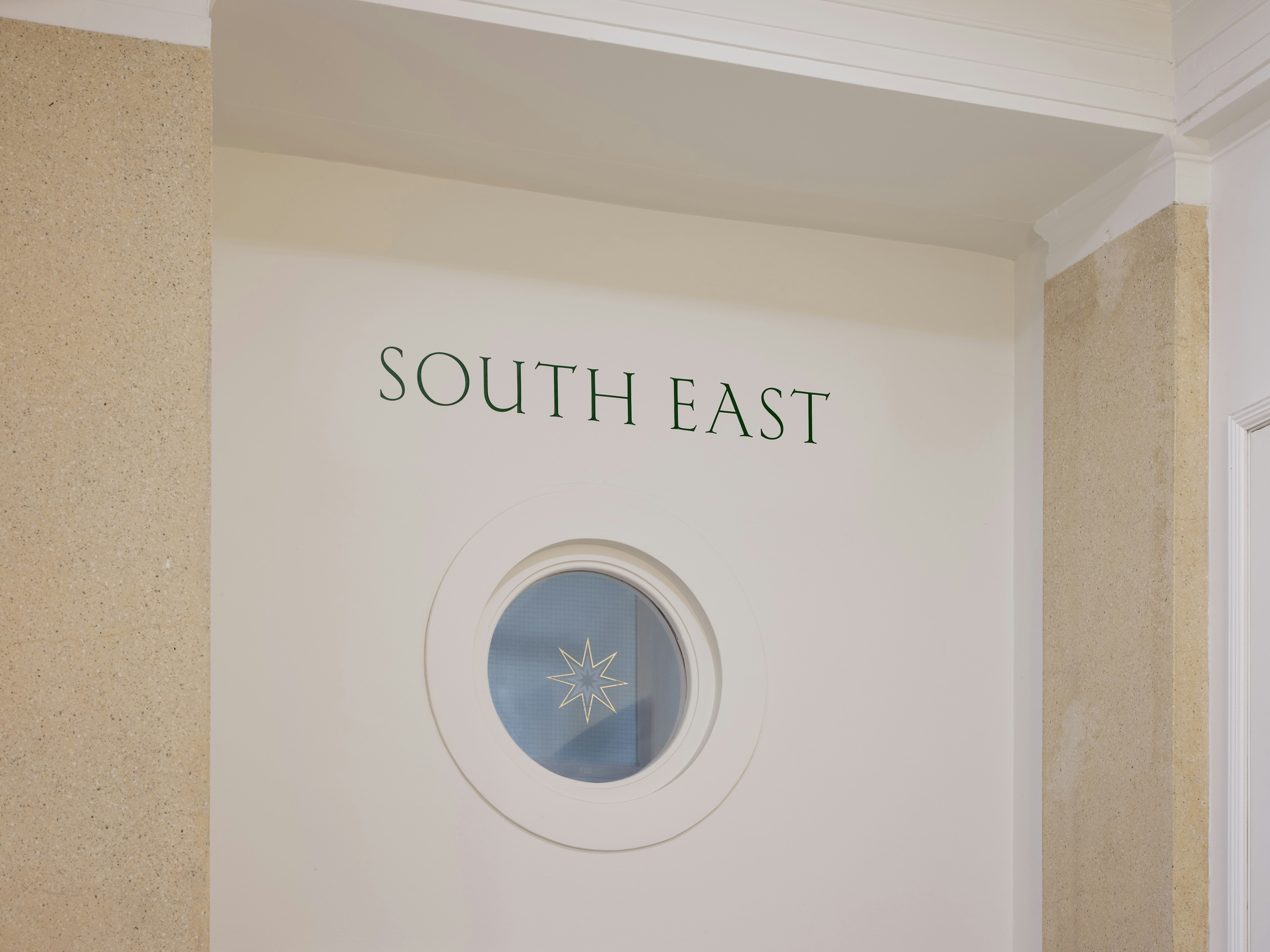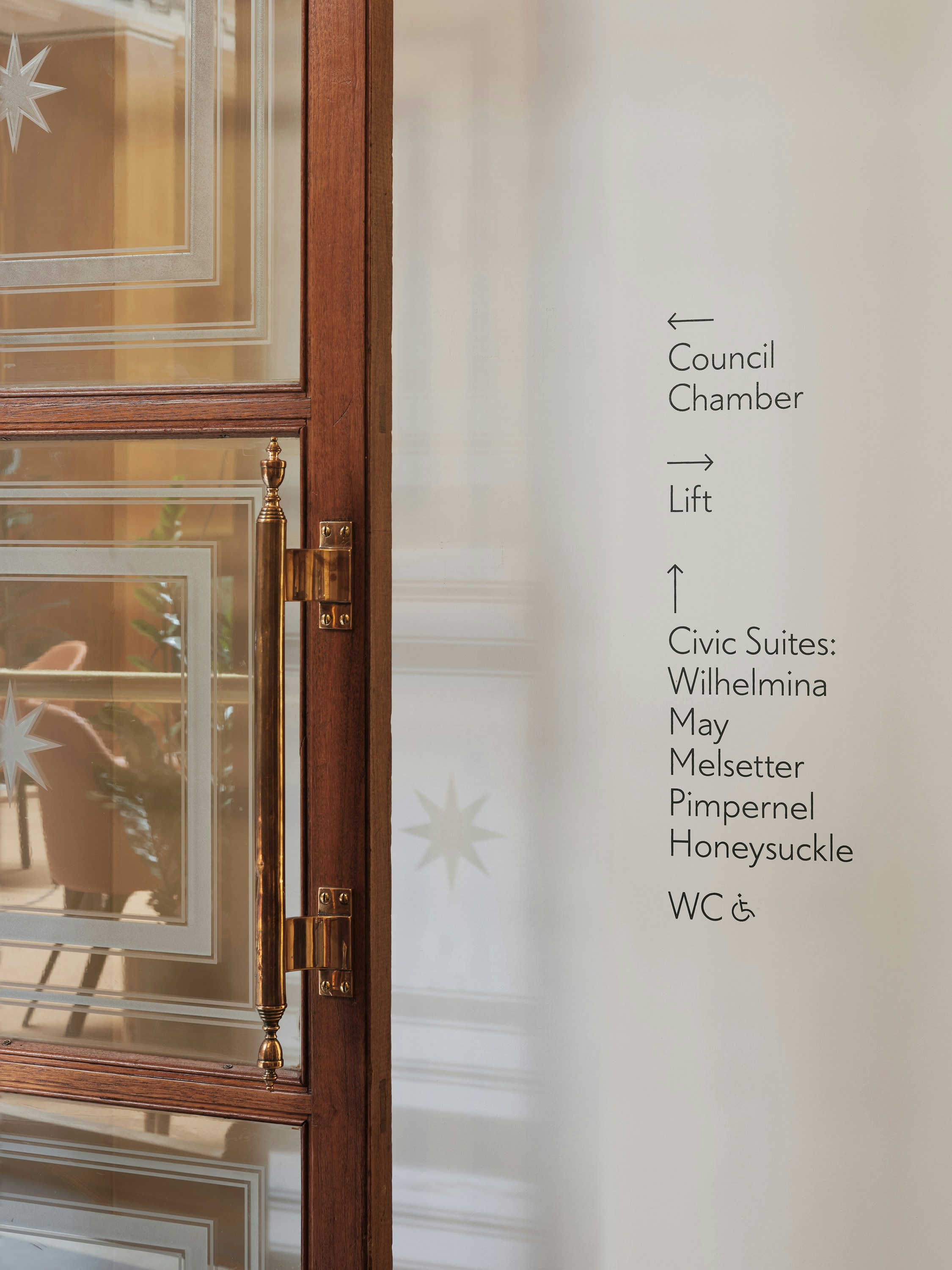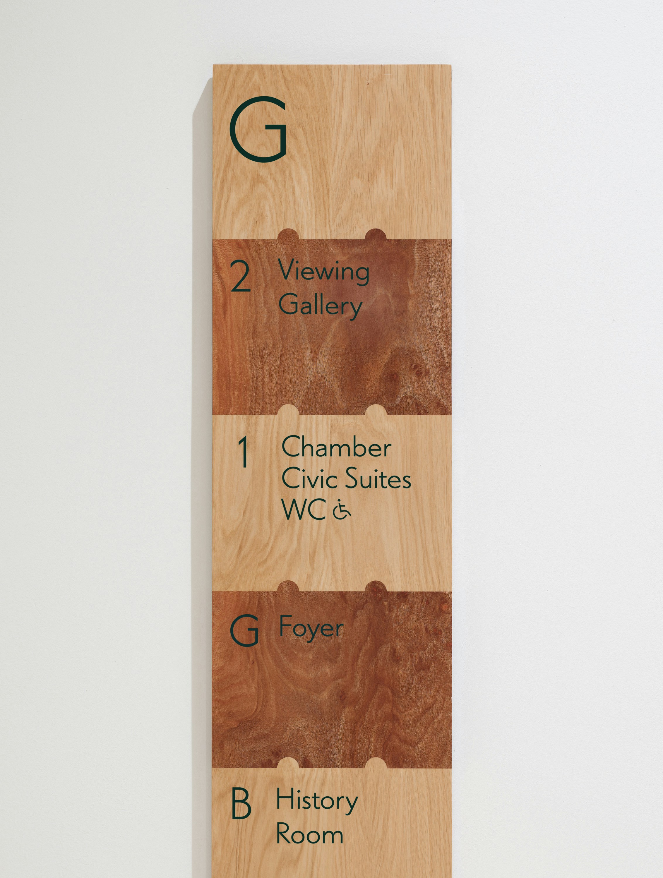 The scope extended to a family of clocks for the civic rooms and chamber room. Granby, an early twentieth century typeface was chosen to compliment the interior style. Cardinal points are displayed in Kessler, a modern typeface influenced by the same period.
