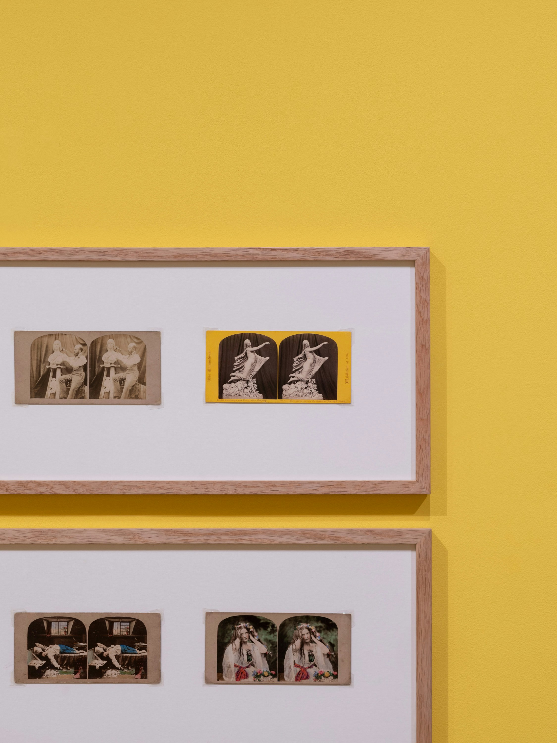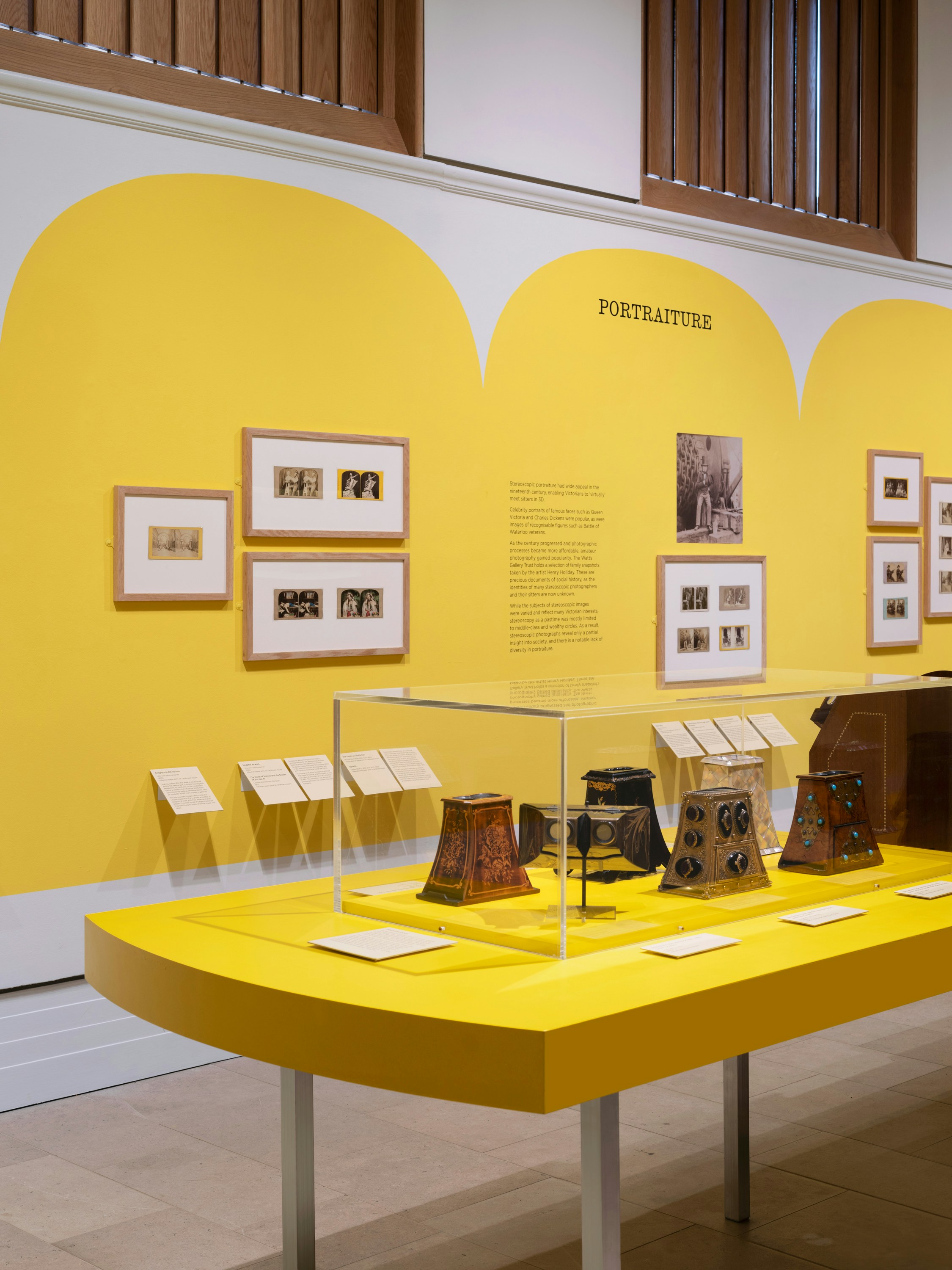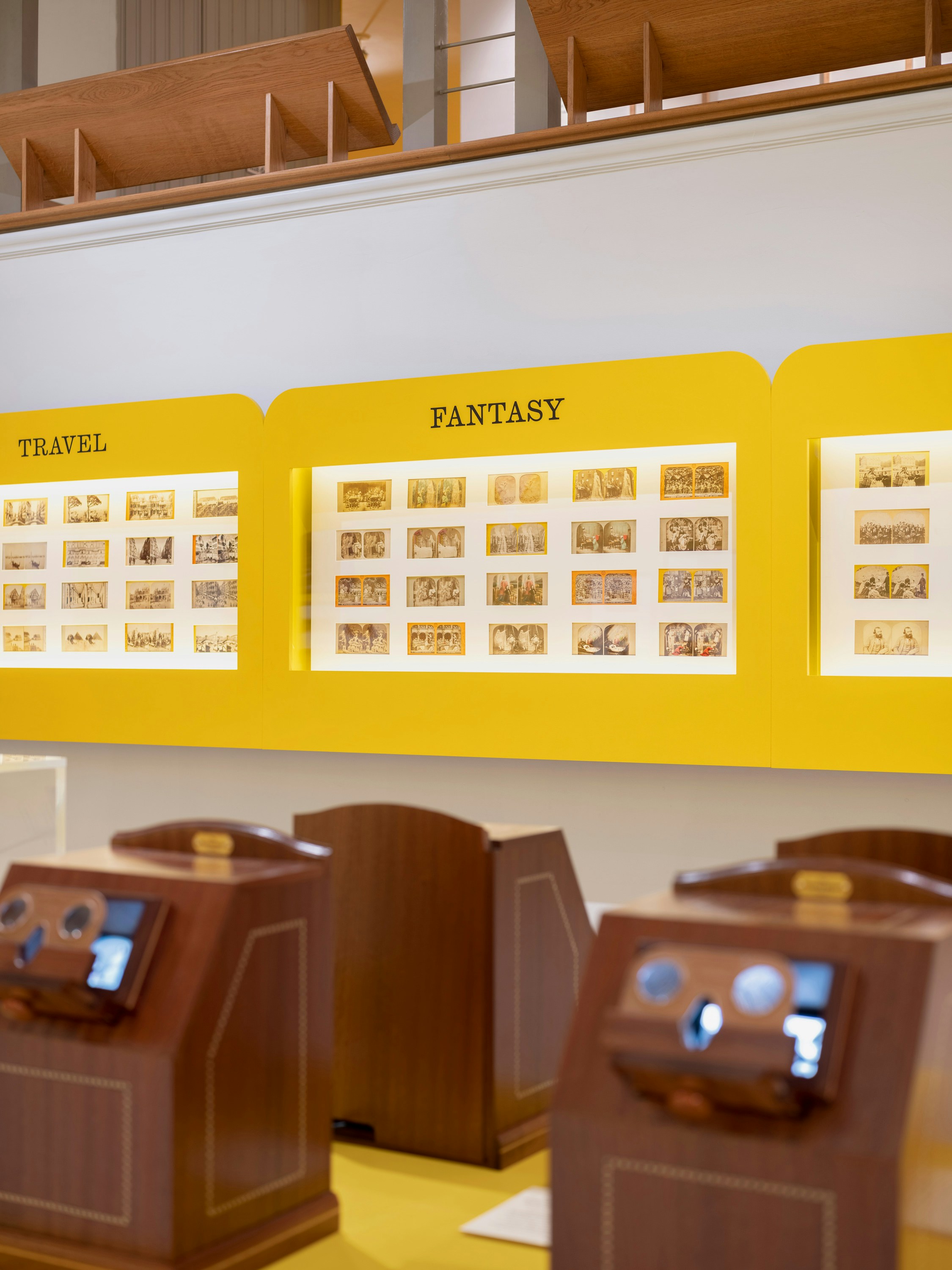 Many of the original stereocards are framed within two arches. This motif – and the bright yellow coloured card commonly used – is referenced in the exhibition design.