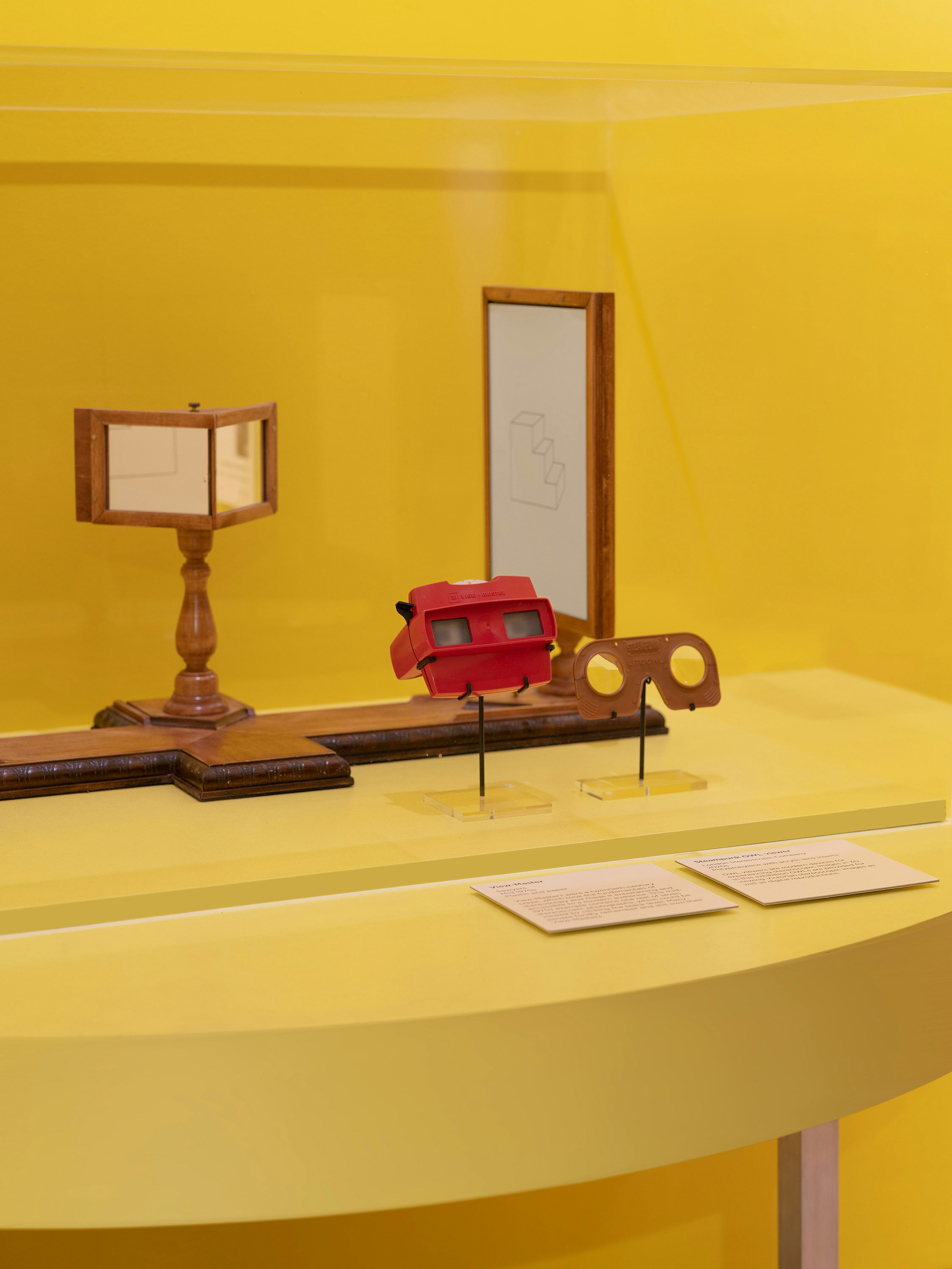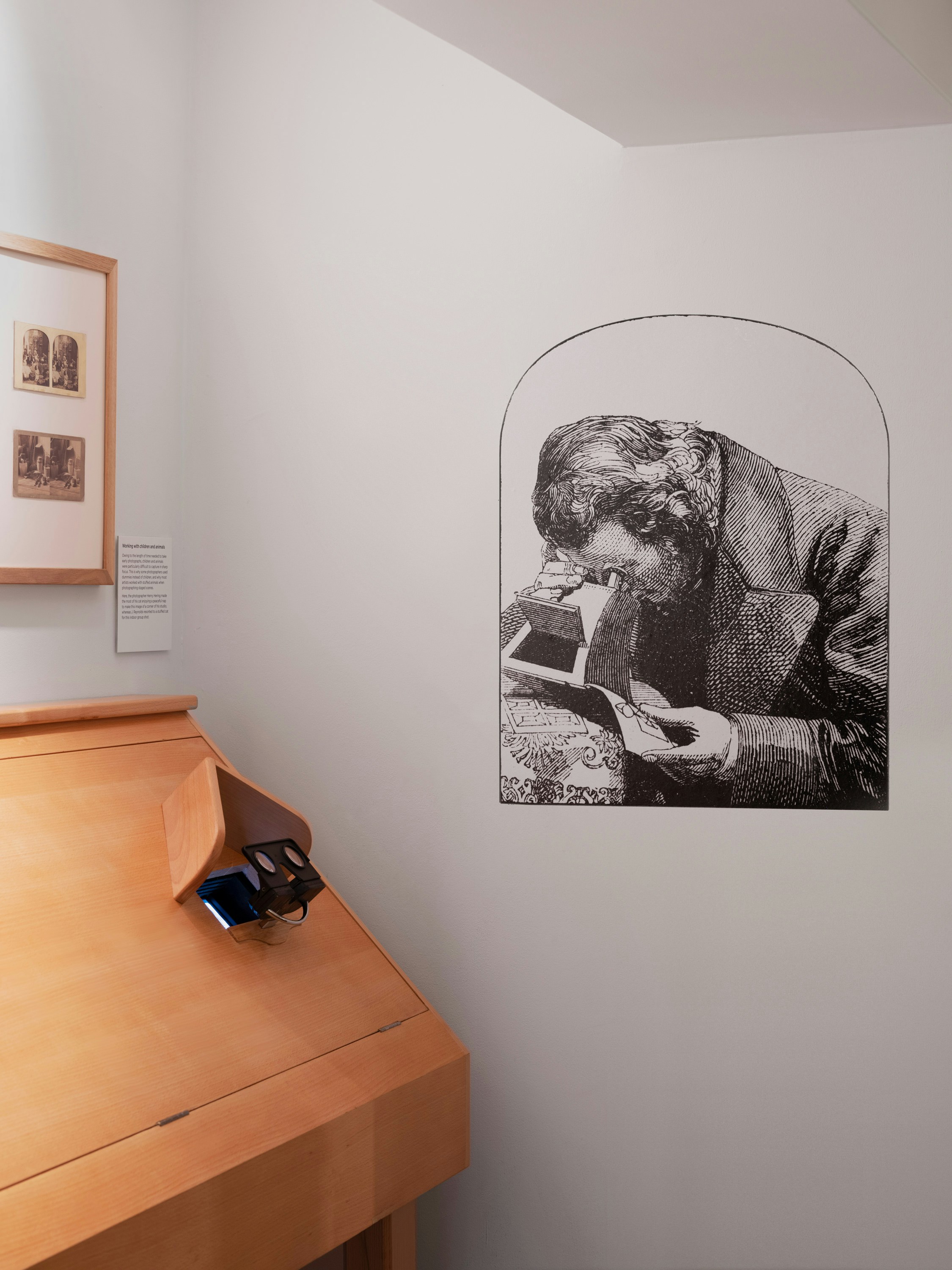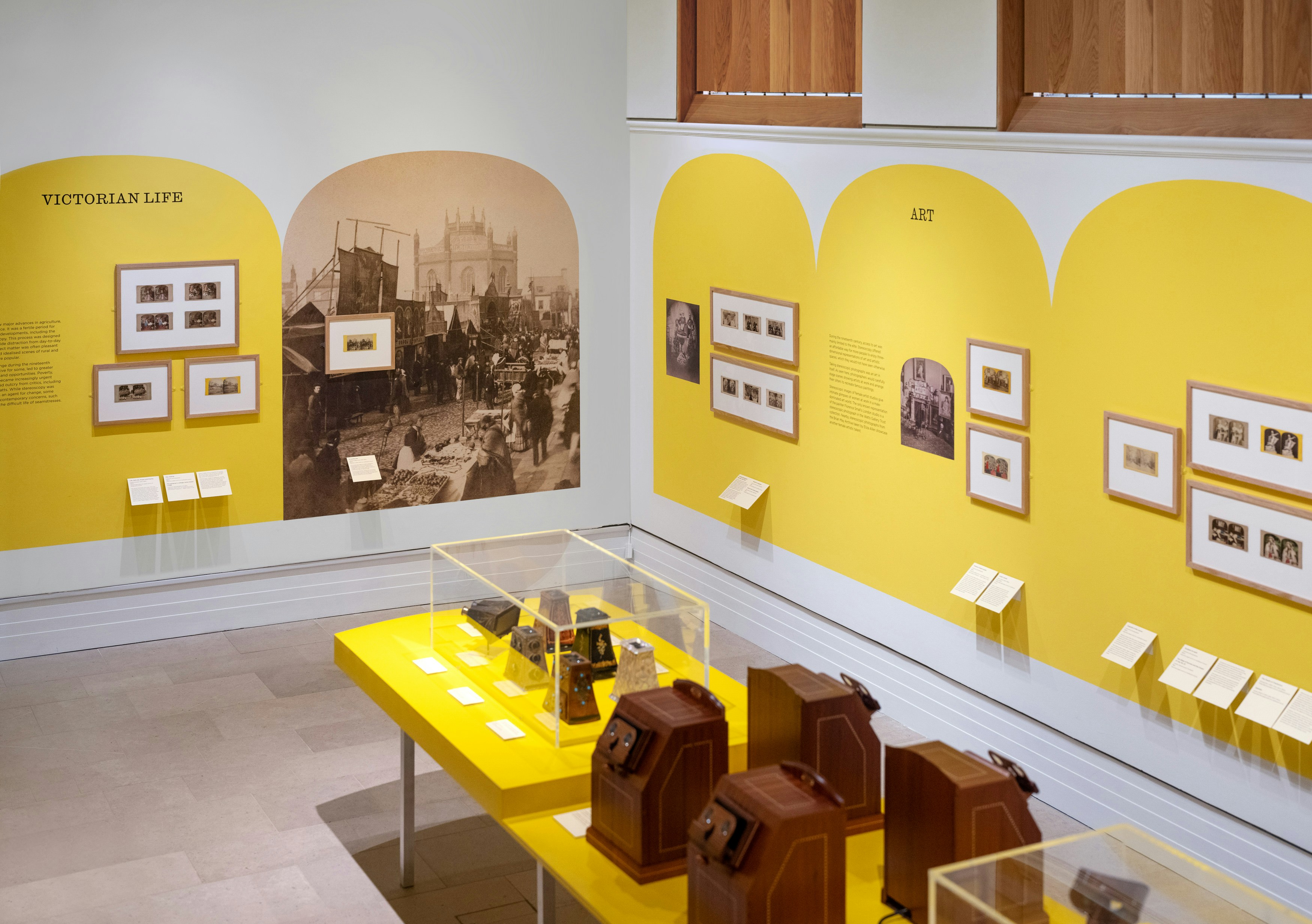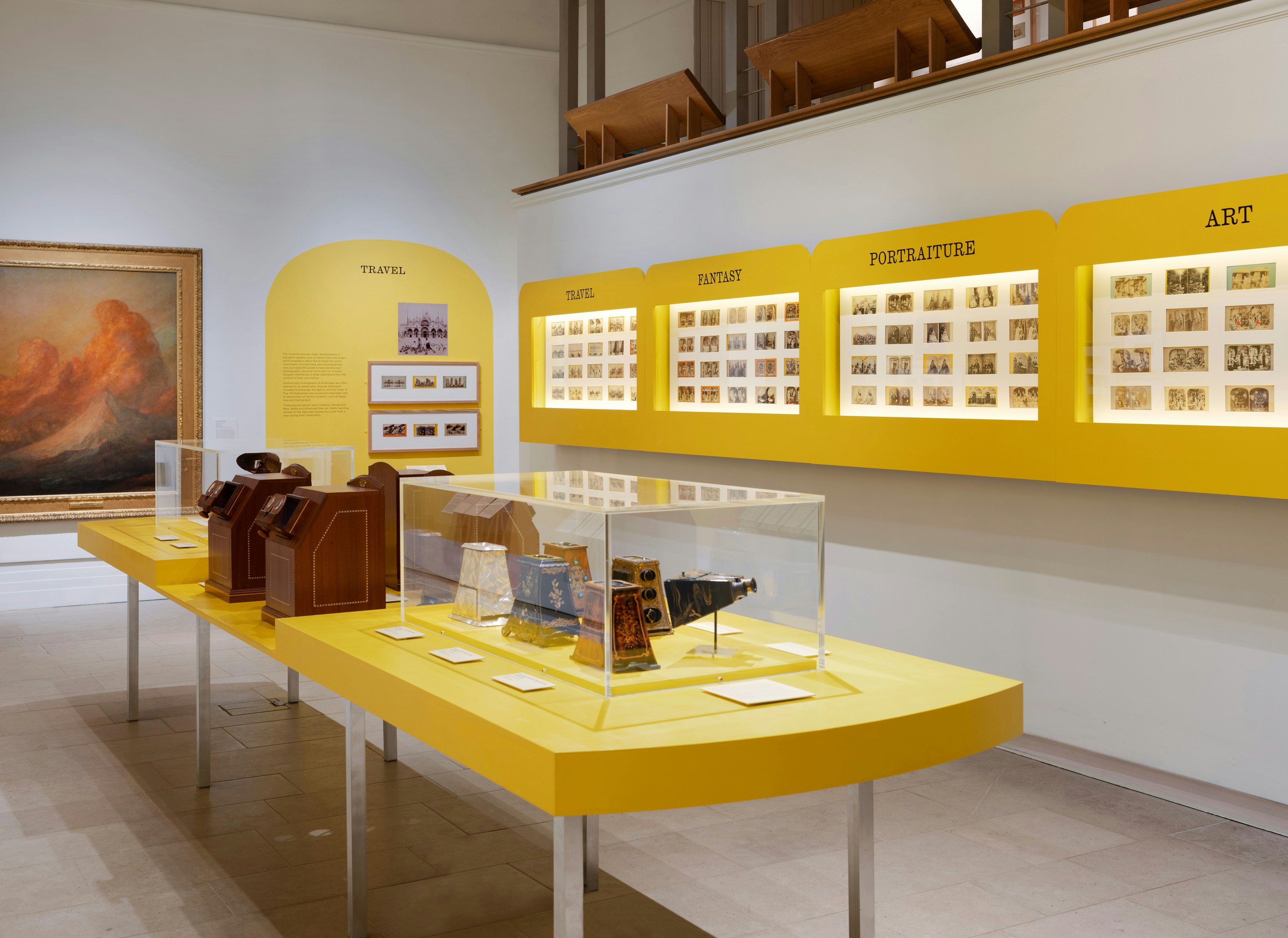 Many of the original stereocards are framed within two arches. This motif – and the bright yellow coloured card commonly used – is referenced in the exhibition design.